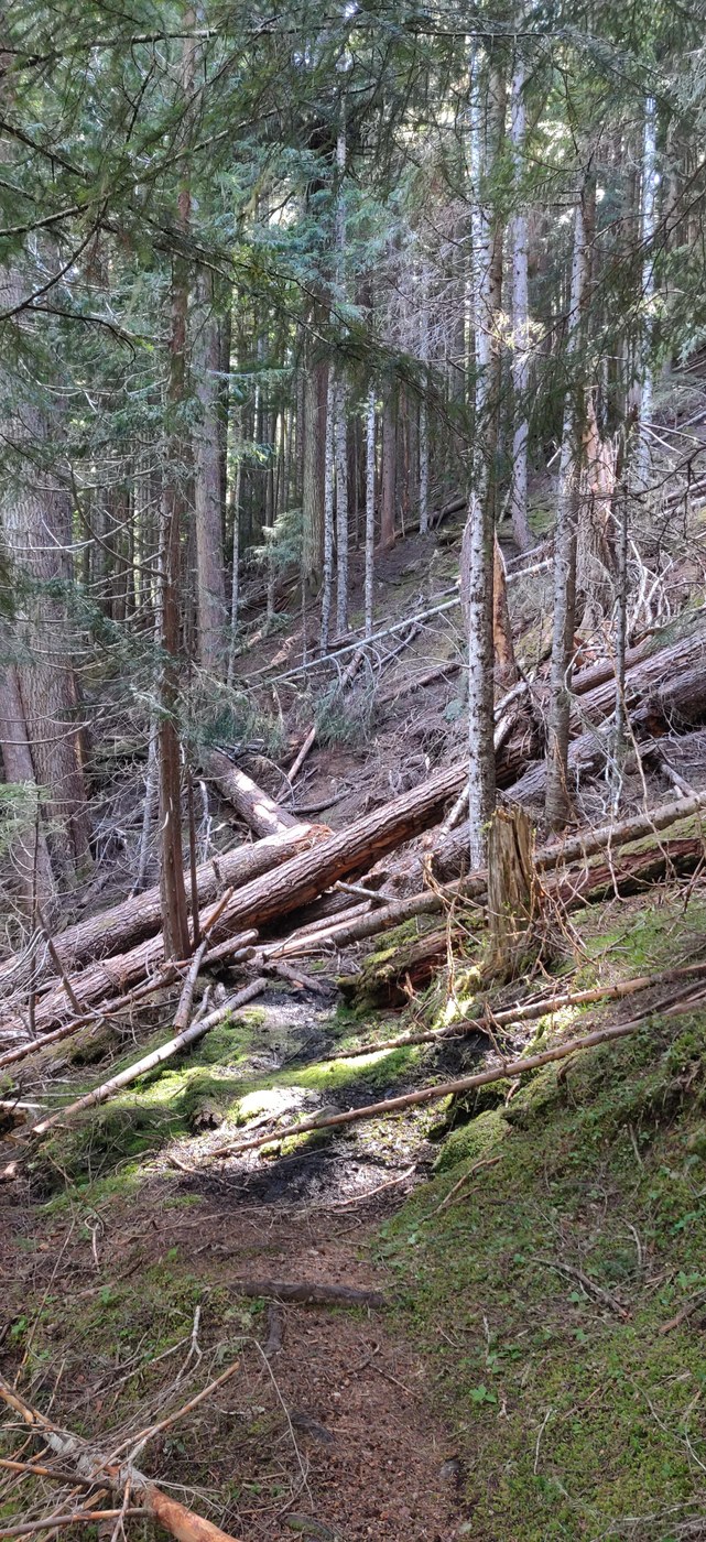 The trail is in beautiful condition early on. The trillium is in full bloom and there are plenty of small waterfalls and interesting trees and moss to see. But the farther you go, the more obstacles. At mile 6.3 there's a bridge out, but two nearby options for log crossings. Just past that, there's a series of blowdowns that are difficult but not impossible to navigate (see photo). At mile 7, there's another water crossing that showed no good options and the water was moving aggressively, so that's where I turned around. The only snow I saw on the trail was just across this final crossing I could not make.