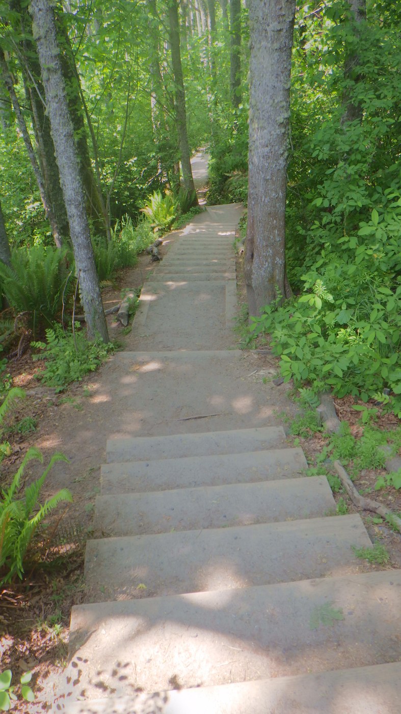 The tread is in good shape, though the bottom of the box steps can be a tall step due to erosion. Lots of birds out and about, and it looks like the salmonberries will be ripe soon.