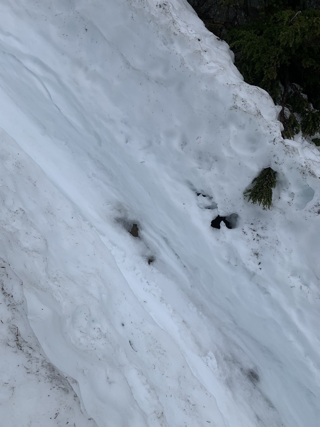 Cannot drive to upper trailhead yet. Snow free road to lower trailhead. Glissade chute has a couple spots with rocks and trees coming through. Snow starts just below summer trail turn off. Photo of road to upper trailhead and two photos of glissade chute.