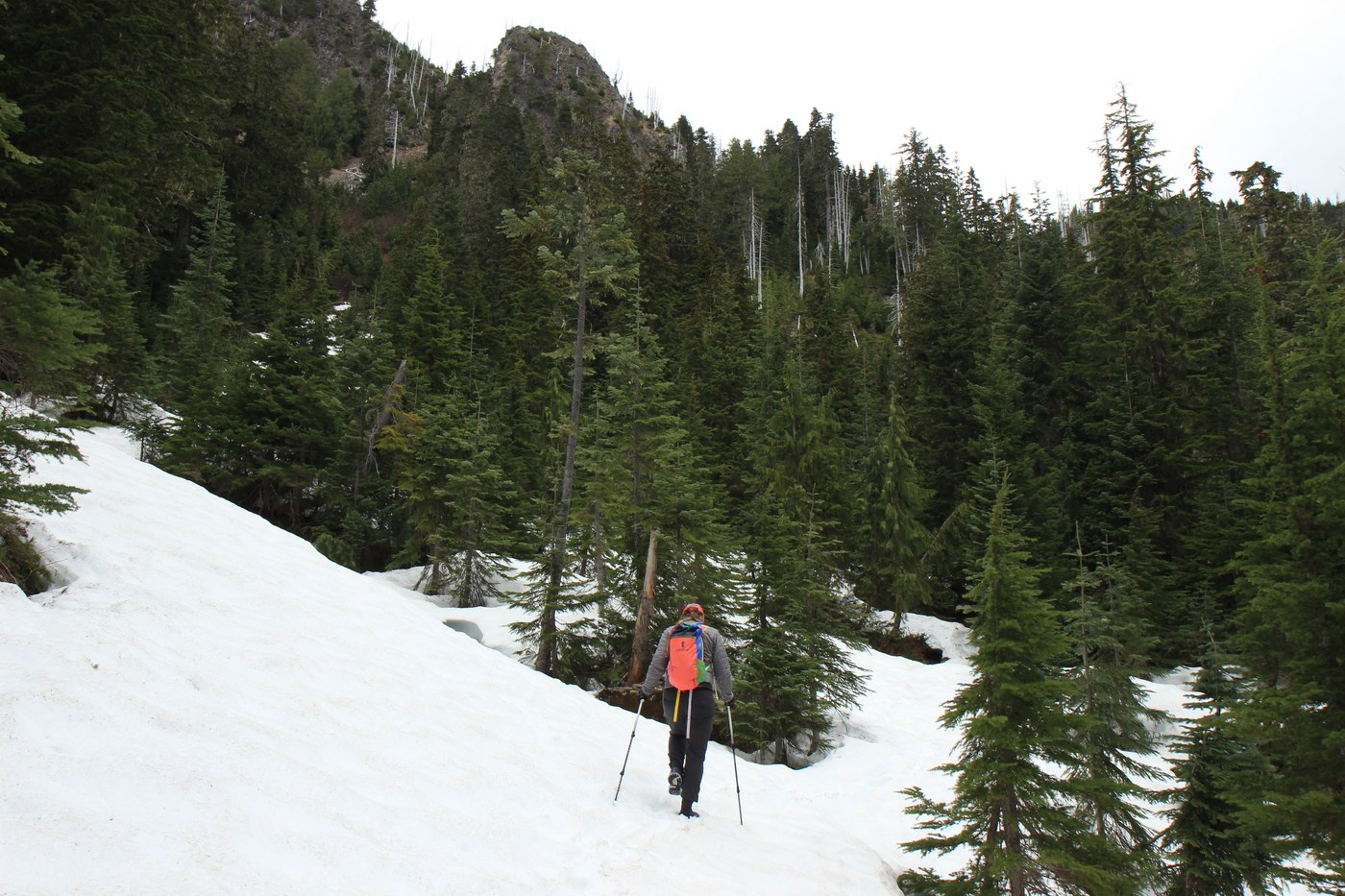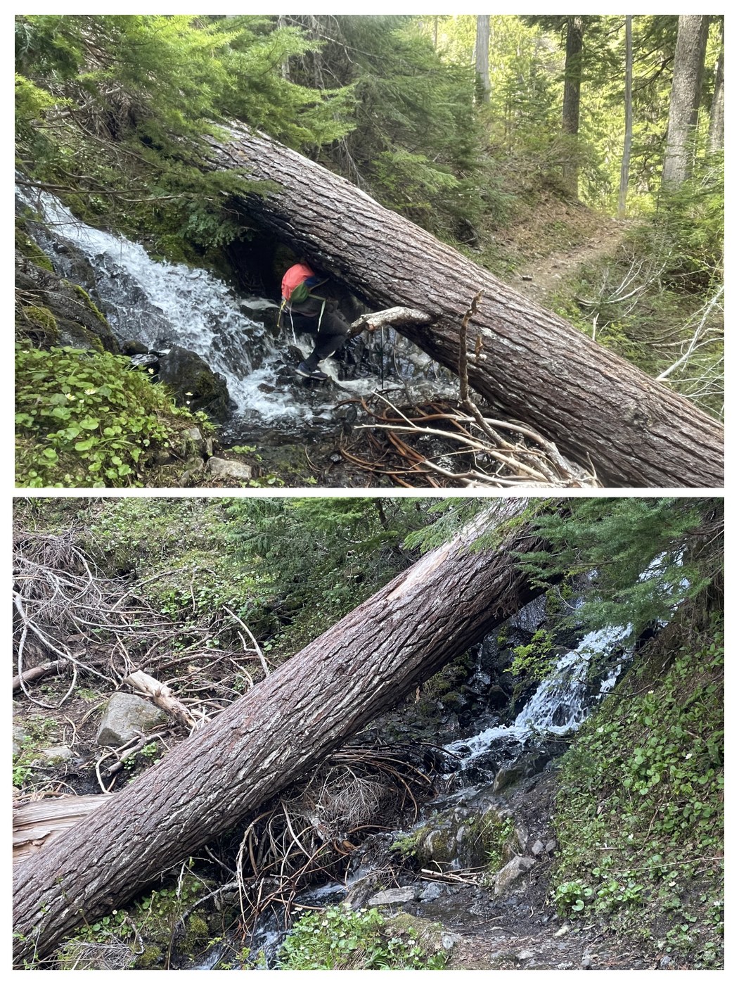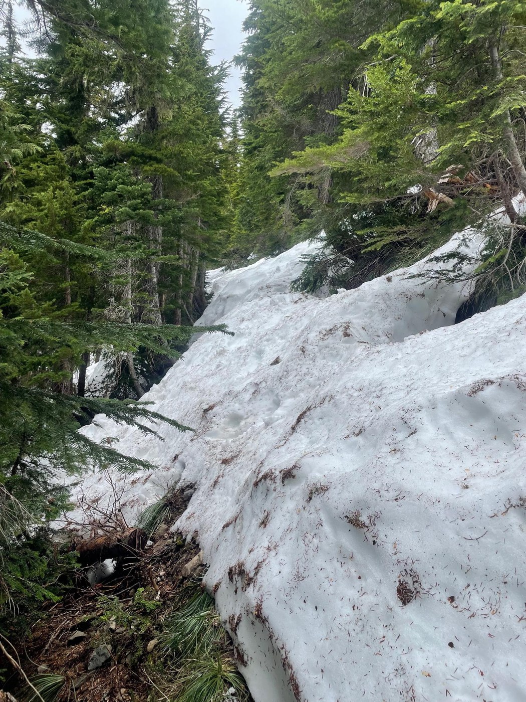On the second day, I had originally planned to try to get back to the glacier, but after talking to some other hikers who had said the snow was pretty sketchy past Elk Lake, I decided to go for Hoh Lake instead. The trail from Hoh River to Hoh Lake is pretty rugged... It climbs pretty steeply up to the ridge and then mellows a bit, but it's around 3,700 ft gain according to Gaia. There are some blow downs, overgrown sections, and one spot where a blow down goes directly over a creek and it's very challenging to go under it without getting wet. Still, we managed. There is quite a bit of snow before the lake, with some sketchy snow bridges that we collapsed around the edges of trees. Unfortunately we had to turn around like 200 ft before the lake because there was really slippery piles of snow at a diagonal angle that I didn't think would be safe to navigate in trail runners without spikes (my friend forgot to bring her spikes). I think there will be snow for several more weeks, weather dependent. We passed by only 2 hikers on this section, and they said they had to camp on snow at the lake because none of the camp sites were melted out. There was a camp about a mile or so before the lake that was melted out (it's not on Gaia, but there was a sign saying last campsite where you can have a fire). This campsite had good water sources.