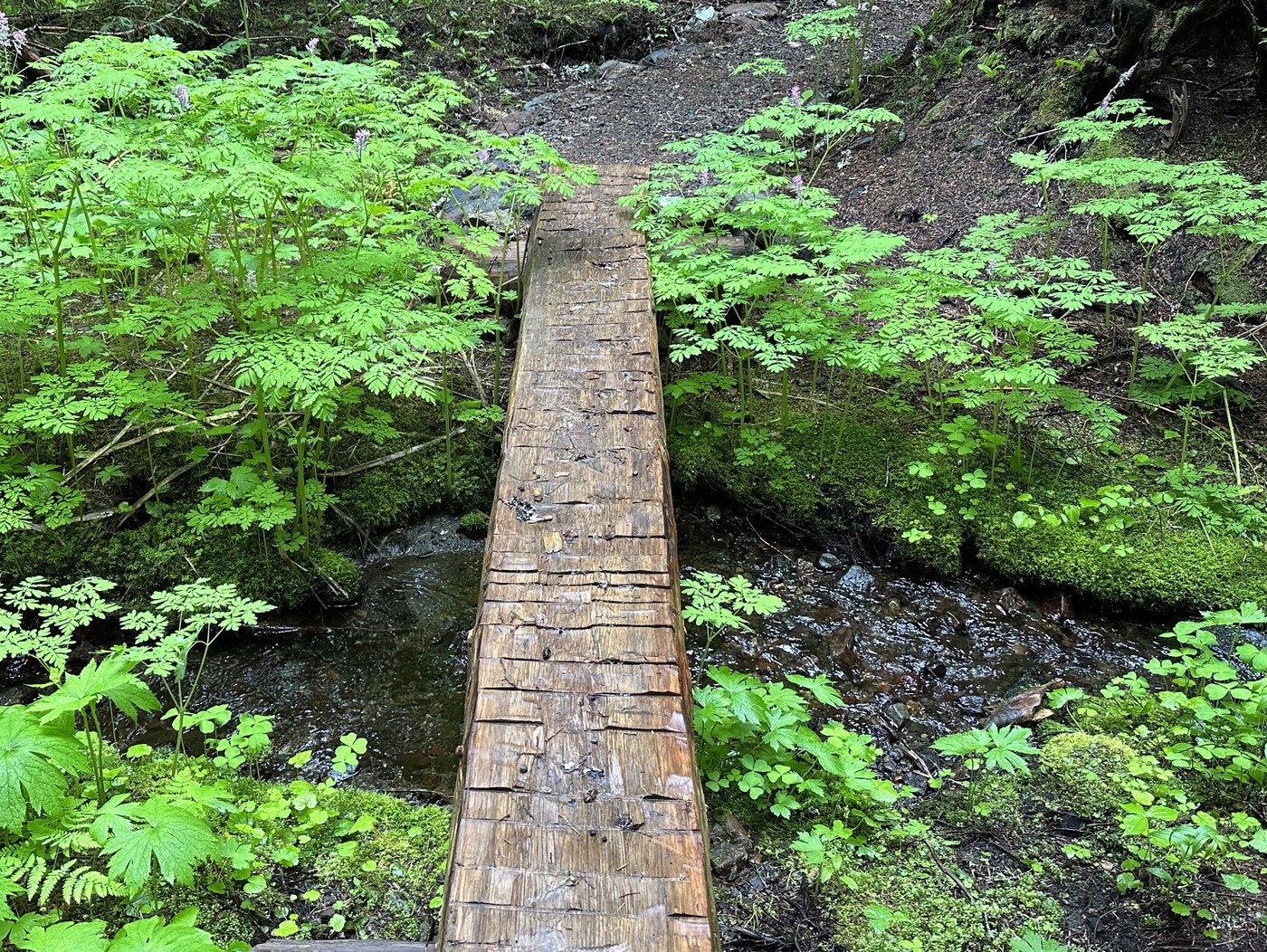 The connector trail and the S. Puyallup trail are snow free with a couple of blow downs (easy to get over) to the campsites. Today there was an inversion layer. Hence, it was raining/misting until I got to the 4,600ft level. The beginning of the S. Puyallup trail is really green after all of the rain.