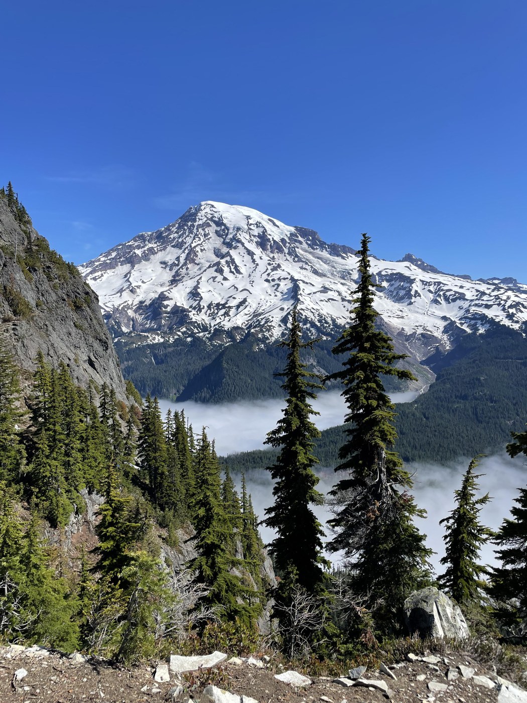 What a great trail! Felt easier than the elevation. Got great cloud inversion at top and could see Rainier, Adams, Helens and Hood. Trail great condition - very intermittent snow towards top, but easy to follow and no spikes needed. Parked at Longmire by bathrooms and walked over.