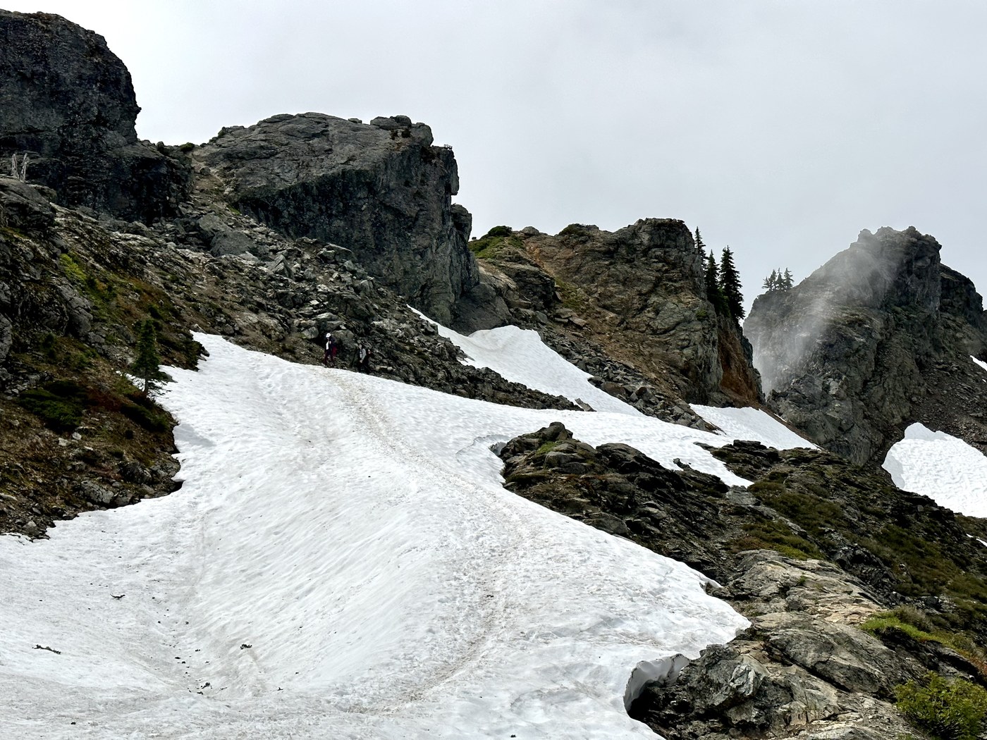 Last stretch of the trail runs along the ridge. There is a junction with trail towards the lake - make sure to follow right path when coming back. Approx. 0.3 mi from the peak, snowfields begin. No gear is required to cross them, though poles may help when descending. Last 0.1 mi is an aggressive climb over loose rocks to the summit, where one will be rewarded with 360 degrees - or 180 degrees today - views.