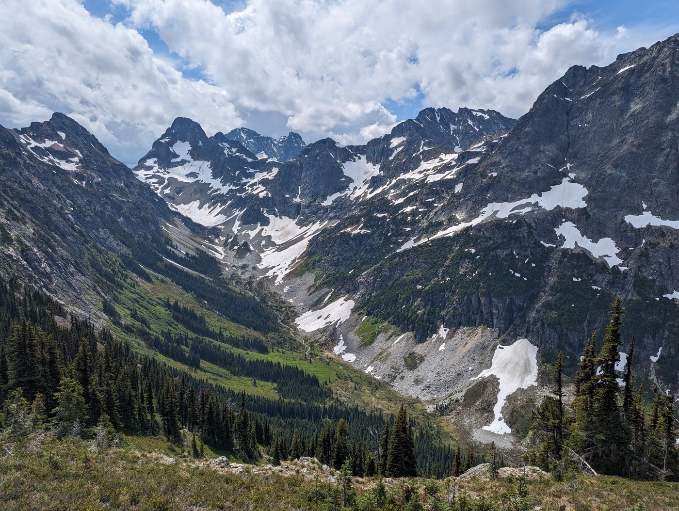 The trail is logged out (thanks!) and creek crossings are reasonable. There are a few patches of snow towards the top, most of which are easily crossed or bypassed. There is one slightly tricky patch that either requires following the moat above the snow field (it's tight in one section) or cutting the switch back to bypass altogether (pretty steep). I preferred the moat, but I think it will hopefully be melted out soon either way.