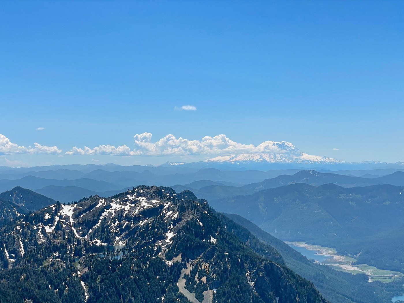 Lila Lake comes into focus and disappears along the ascent, revealing other crystal-clear lakes dotted with snow. Facing south, Mount Rainier peeks above the hills and clouds. Rampart Lakes are also visible from the trail to the peak. In addition, Snoqualmie Pass ski resort is easily visible – fascinating to see the runs and lifts from this angle.