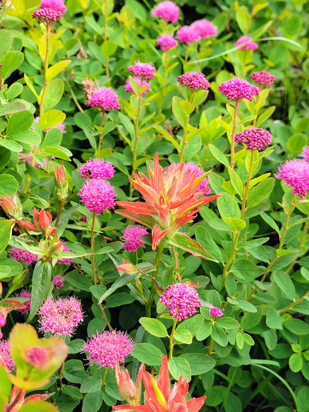The carnivorous round-leaf sundew plants, in boggy areas at the northern end of Ollalie Meadow, are amazing (pictures 1 and 2). Watch your step, some of them are very small. At the meadow there are also a lot of bog/alpine laurel (photo 3), white marsh marigolds, shooting stars, and many more. The ski slopes are colored with crimson paintbrush and rosy spiraea (picture 4). Other flowers that caught my fancy: baneberry, the first pink mountain heather I have seen this year, thick bunchberry, strawberry bramble. and lots of butterflies and views on Mt. Catherine. A link to the Burke info for the sundew plant is attached.