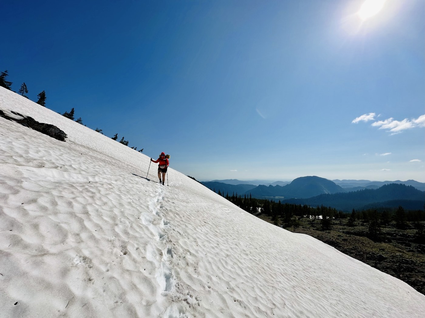 We spent the rest of the day hiking through wildflowers, dropping in and out of washes, and hiking across the blast zone. It was super pretty. Again due to the early season conditions we crossed many seasonal creeks from snow melt, and water was never an issue. There was 1 gully on the north side that was absolutely destroyed by the melt, it’s super steep and loose with no apparent path down, maybe 30 foot runout of razor sharp pumice. I slipped on bad footing but was able to stop myself from sliding, it did give me quite the scare though, and forced us to take a very slow and methodical path down. We ended the day going over Windy Pass, ascending the North side was no issue, but descending on the south side, felt very sketchy. At this point I was tired and feeling pretty insecure in my footing due to my slip on loose rock earlier in the day. The traverse down was super steep with lots of loose rock and the route was so faint I actually turned around and looked at my partner and said this can’t be the way. He unfortunately confirmed I was wrong, and took over on routing us down. It look me quite awhile and I certainly had a few moments where I questioned my ability to make it down safely, but with a little guidance from my partner I made it down without any slips.