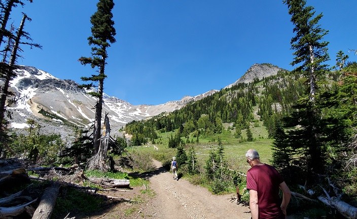 Back on the Glacier Basin trail, the route is forested interspersed with open areas hosting wildflowers & butterflies, as well as occasional wide open views toward Goat Island Mountain (south) and Mount Ruth (west) with Liberty Cap and more behind. The last half-mile to Glacier Basin camp might feel like work (now you’re more than a mile above sea level) but rewarded with arrival at a broad mountain meadow. Today filled with glacier lilies, marsh marigolds and unimpeded views of St Elmo Pass with climbing groups laboring their way to base camps above Mt Ruth. [More pictures included in linked photo album]