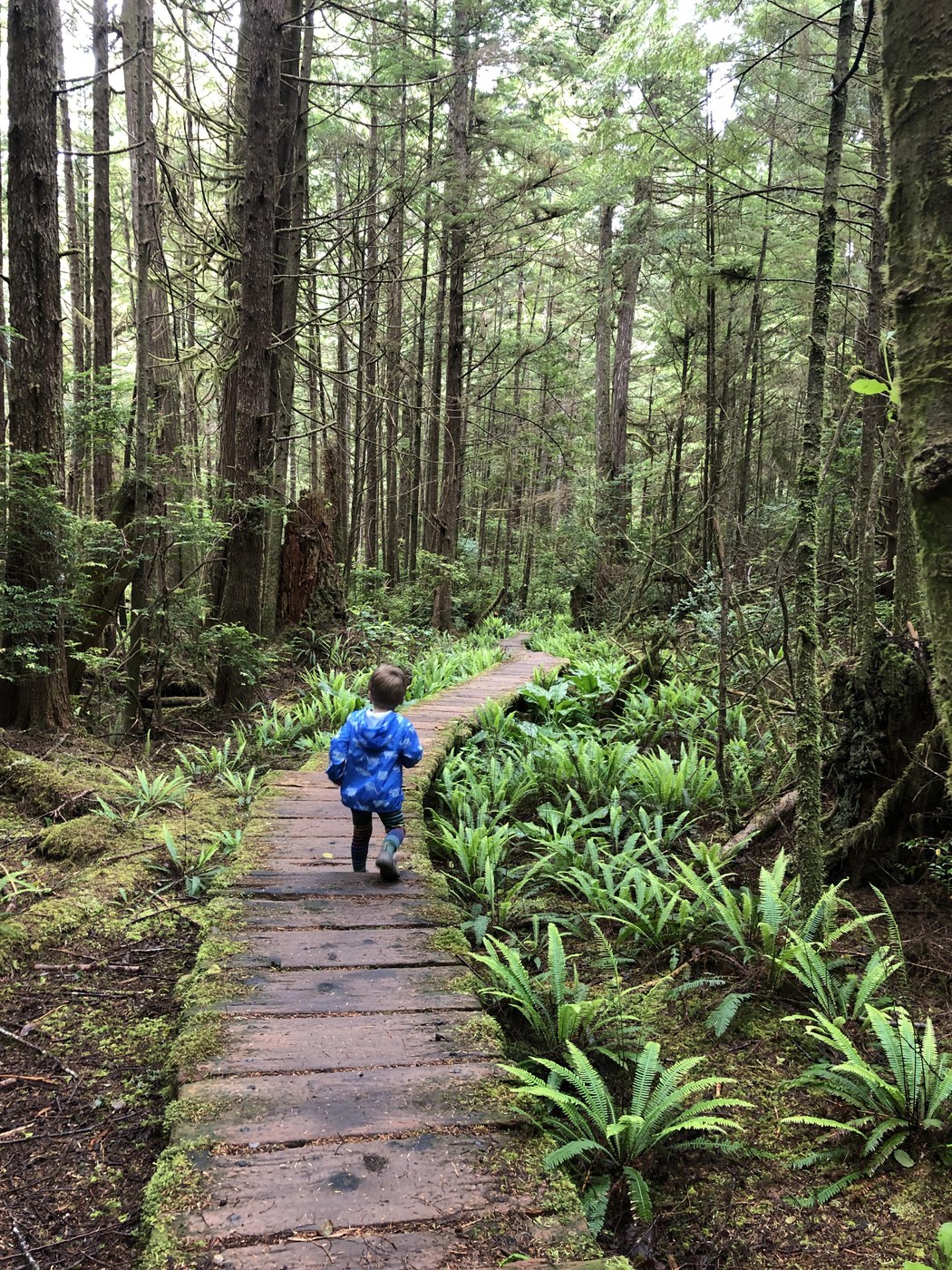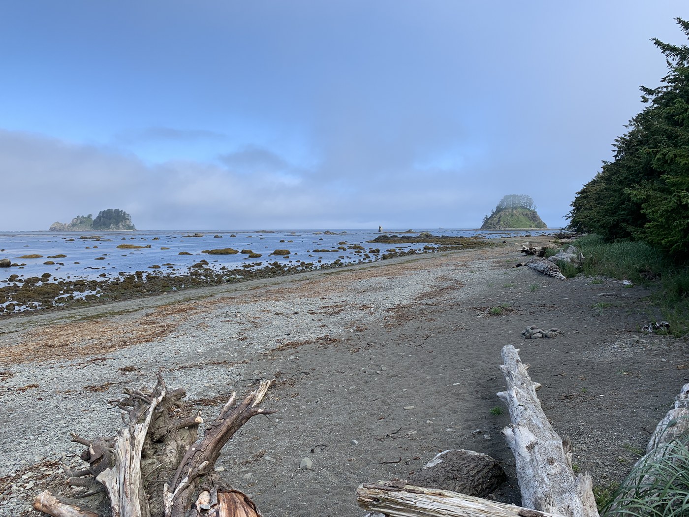 Salmonberries were ripe near the trailhead, and everything was lush and green all the way to the beach. A few holes in the boardwalk here and there but a very well maintained trail.
