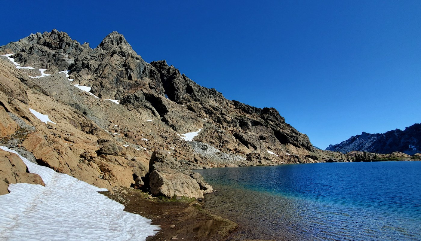 Great news!!! No mosquitoes! Yet. I worked my way around the west shore of the lake. This does require some scrambling and getting across a steep, lingering snowfield. If you are comfortable on snow, it shouldn't be an issue, if you do slip, the consequences will be minimal as you will just slide into the lake. Maybe not a bad thing with all this hot weather! I worked my way around the lake and paused here to take it all in for a few minutes.