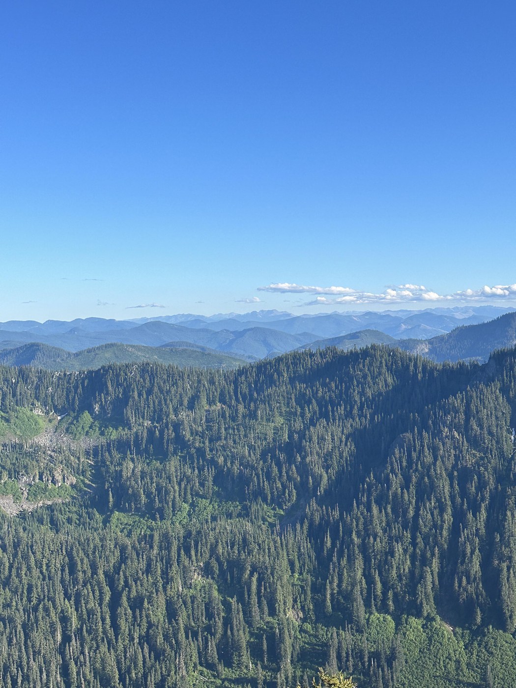 The trailhead isn't even really a trailhead, just a place where the road is a little wider, with the trail leaving directly from the road. It follows what is clearly an old logging road for a bit, then connects to a very rocky trail up the mountain. There was one blowdown on the trail that was a little tricky to climb over, but it wasn't bad either. The trail is short but steep, with some views of the mountains around on the way up. The final push for the summit is very very steep, but not too long.