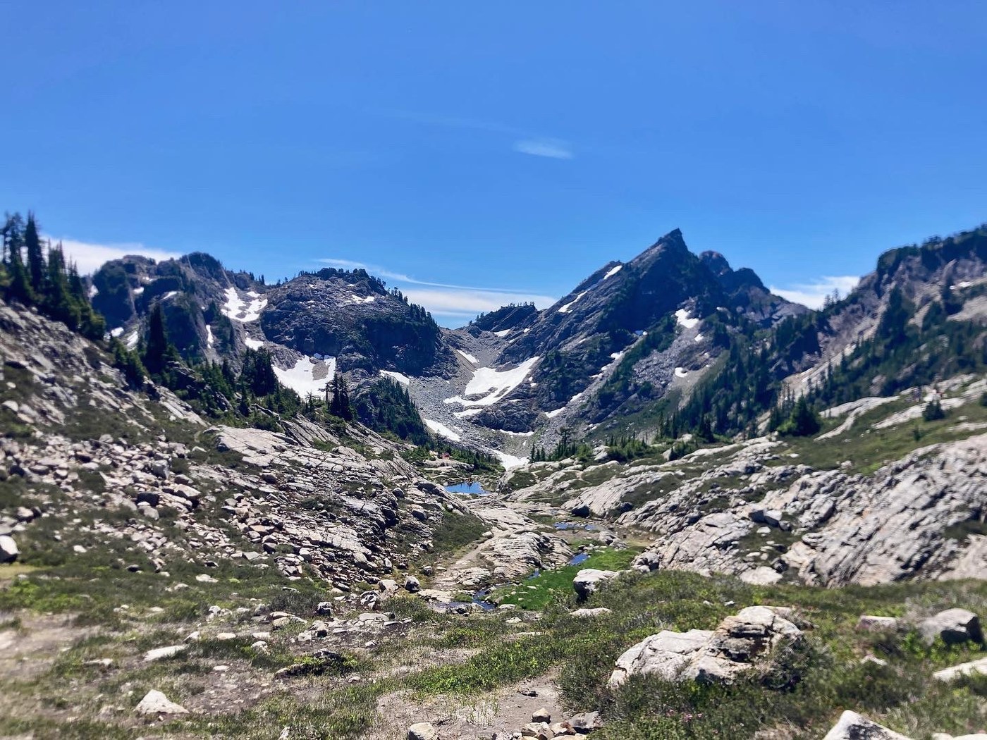 Between lake basins there are some melting snowfields to cross- nothing too difficult but watch your step.