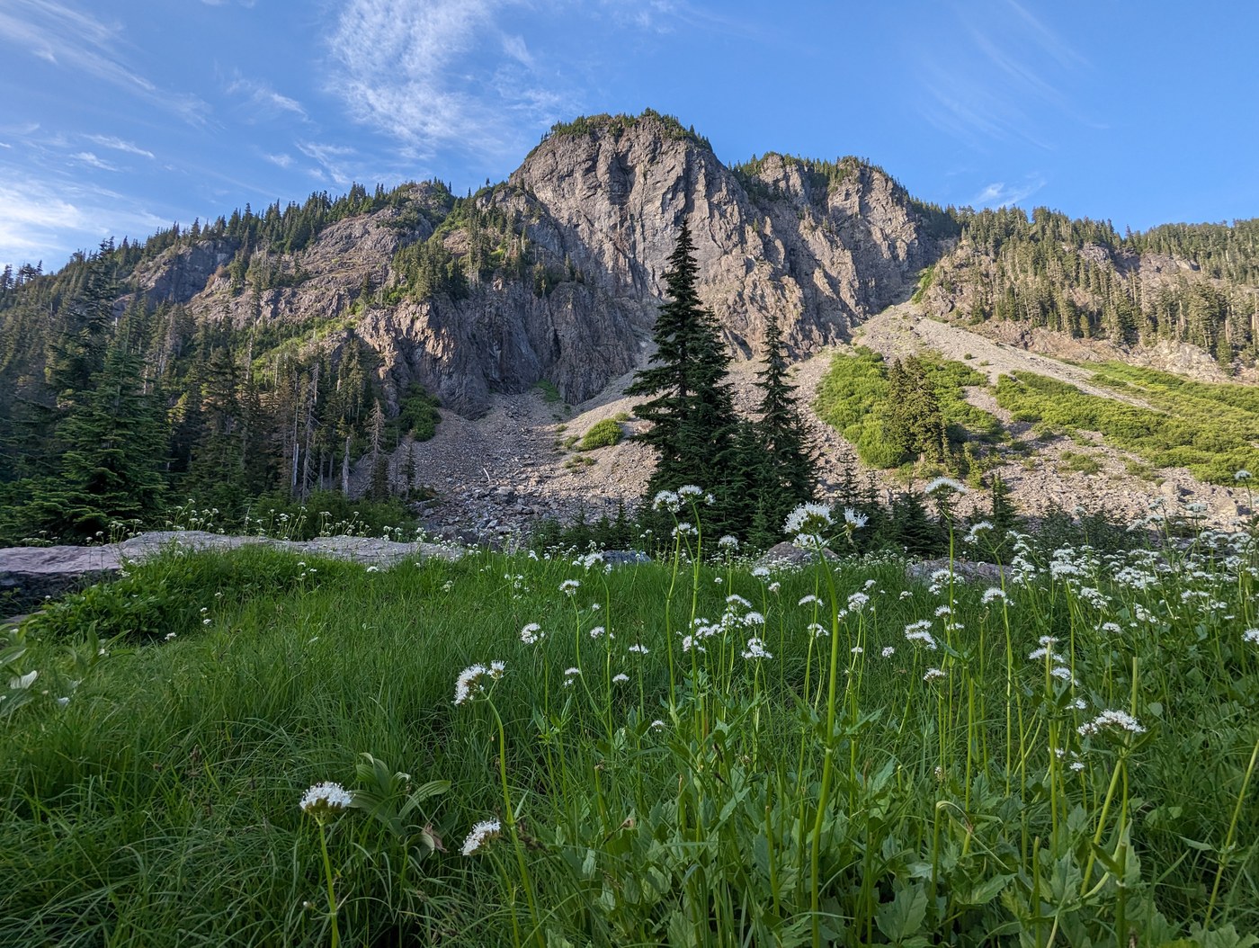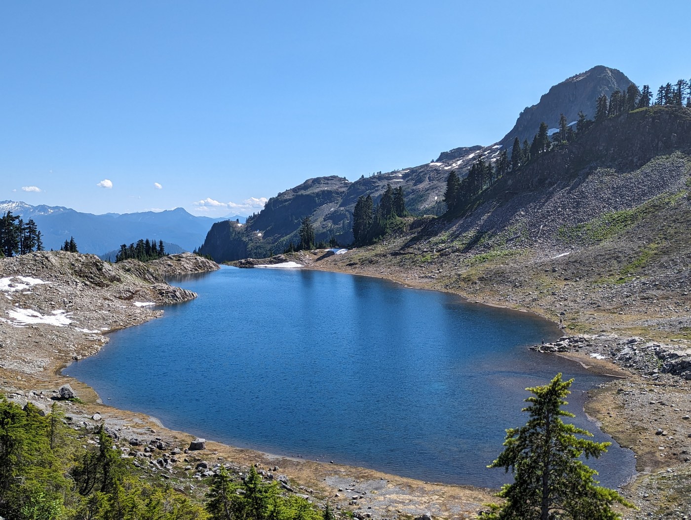 During our break on some nice rocks around Lake Ann, we were pleasantly surprised that there was no bugs. The glacier and North Cascade views were vast and stunning. We saw there was a continued trail called Fischer's Chimney, but we opted to just turn back to not push ourselves too much. Looking up reviews online, it looks like a fairly intense climber's route, so I guess that was the right call for us.
