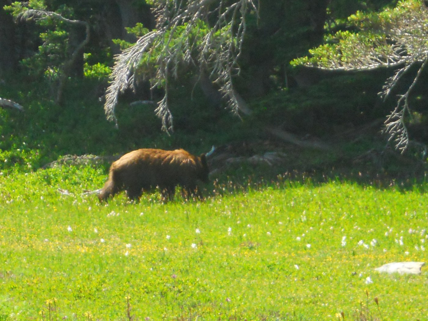 Saw the cinnamon-colored black bear mentioned in an earlier trail report about 75 yards off the main Spray Park trail near the side trail to the mist part overlook.