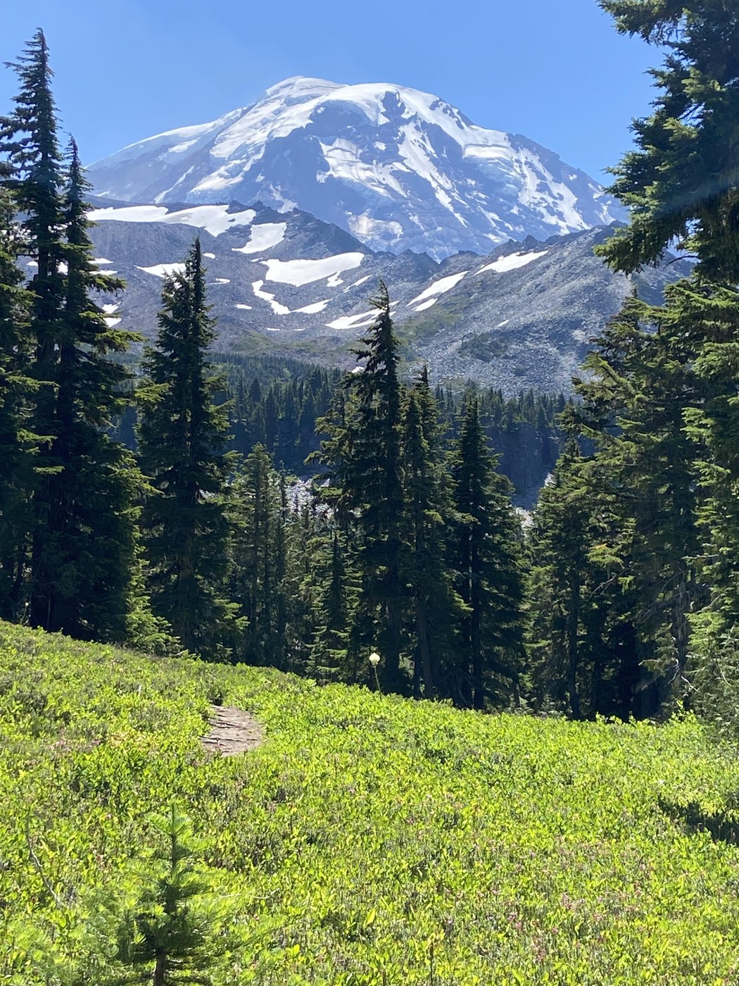 It was a glorious day for the 3 of us. The road is long and a bit rough, although improved with new gravel and some grading done not long ago. We saw a couple of flat tires on the way out. It was a busy place at 9:30 a.m. but still places to park. Even with plenty of cars parked, we did not run in to that many other hikers, as many are parked to camp, or for the Wonderland Trail or for other hikes nearby. The trail is in great shape and a mellow grade until the water fall when then one starts up more earnestly. Once we arrive to Spray Park we had endless views of Rainier and the whole area around the park. The wildflowers were great. It was truly a 5-star day. The bugs were around but nothing to be concerned about.