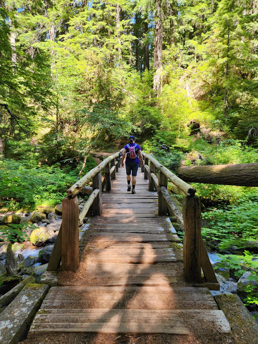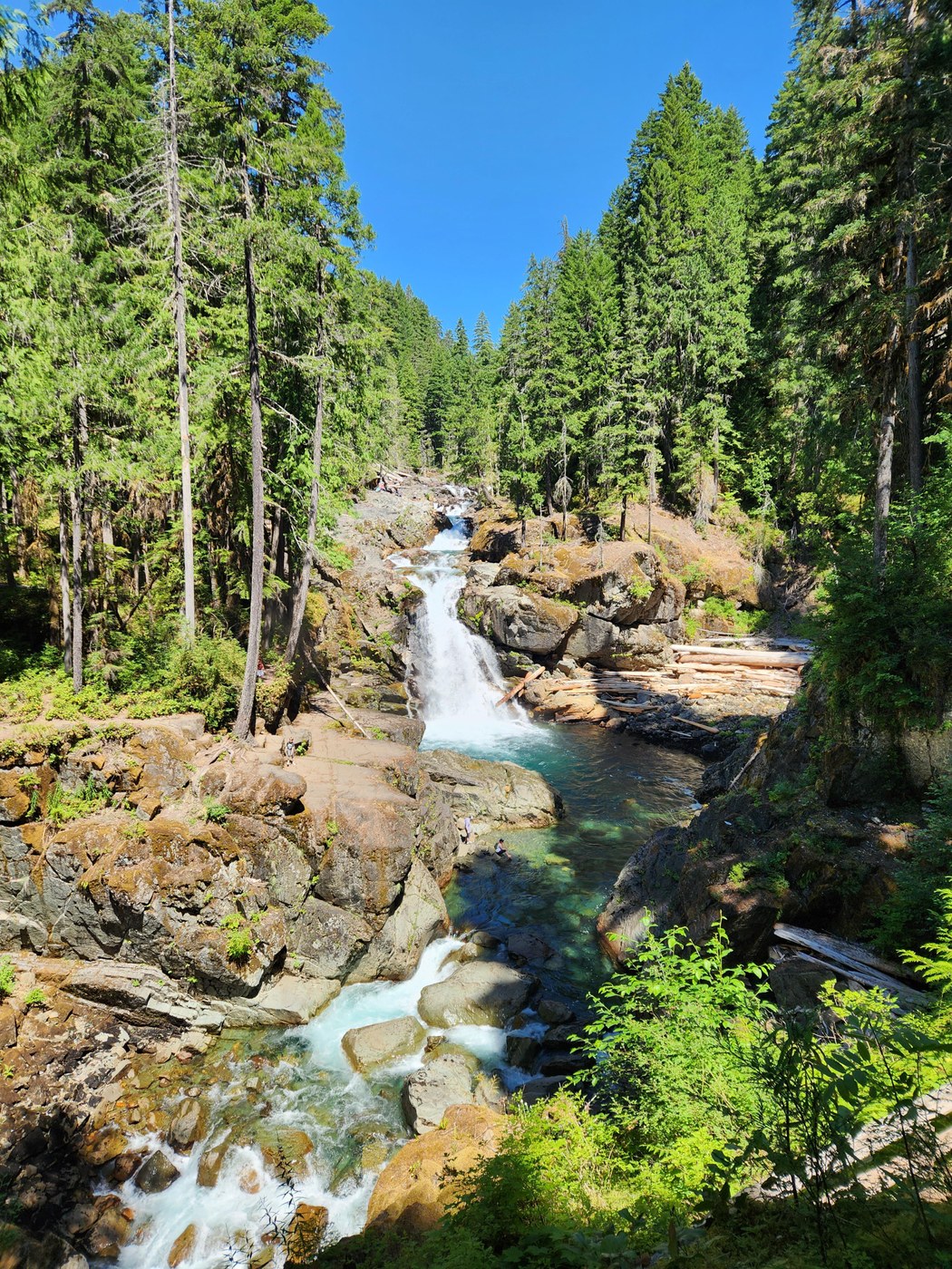 Arrived at 10:30 AM on Friday morning to find all of the no day use parking available in the Opanapecosh Campground. We found that you can access the trail from a roadside lot just north of the campground. It was a great spot to start the hike. This is an easier hike that would be great for kids. There were people, but not too crowded to a Friday in July. The falls are really lovely and the hot springs interesting. We walked a total of 3.2 miles, then headed to Enumclaw for our favorite after hike lunch, Il Siciliano.