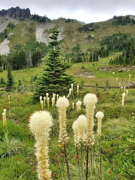 There were no bold wildflower displays in Spray Park. But, still, plenty of wildflowers to admire and cause to look carefully at what's actually present (There are many "quiet" flowers easy overlooked in a big, loud display. I was always a fan of the underdog 🐕). The unique Delphinium flower at Lee Creek (GPS 46.924709, -121.858995) was a new one for me, with few other reported sightings in the Cascades mountain range (Pictures of Sierra Larkspur)