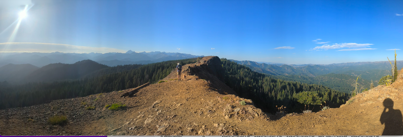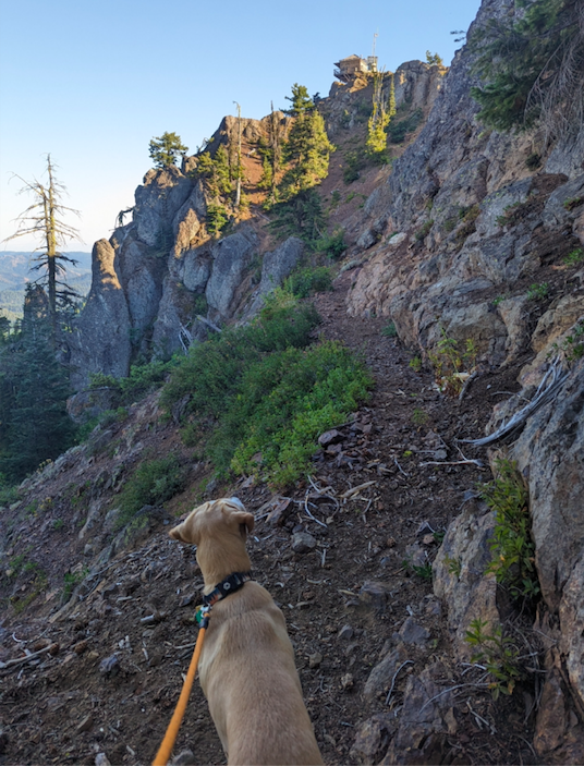 Within a half mile we made it to the fork which gives a choice of the Teanaway Ridge trail (roughly north south) or Red Top (west). We headed up the Red Top trail and in another half a mile or so reached a wall of basalt with magnificent towers, atop which is perched Red Top Lookout. The path narrows as it winds up across the face of rock, and it's somewhat loose rocky and scrambly here, so we had to be super careful with the dog. The view at the top though - wow, worth every sore calf muscle! We were a little surprised at how much the temperature dropped and the wind picked up. It was probably 83° on the way up, dropping to about 60° at the top and very windy.