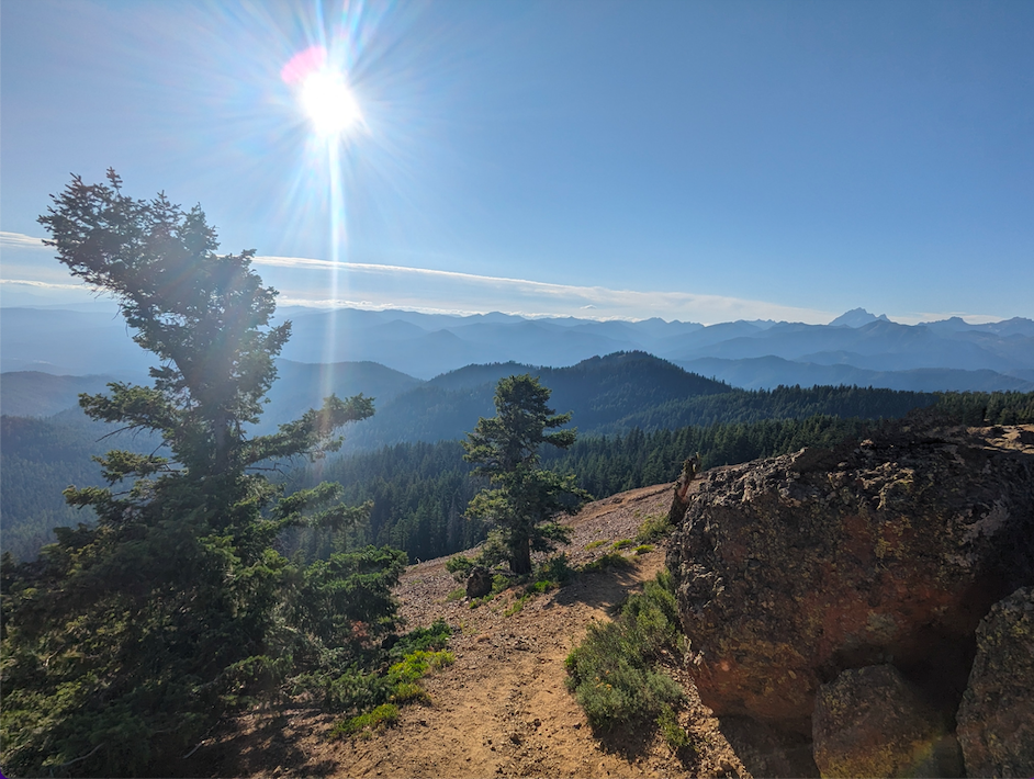 We started out at 4:30 pm and made it to the fire tower in about an hour and a half. It's a stair step most of the way, with only a couple of level spots, though it's very pretty and mostly shaded all the way up, so never felt grueling. There are still some wildflowers blooming in the two meadow areas - Indian paintbrush, phlox, pretty blue flowers whose name escapes me, and many others. In the first meadowy area there was also lots of birdsong. It's very peaceful and pretty. About 2/3rds of the way up there's another lush riparian spot where Blue Creek flows downhill. There's also a cool ruin of a shack just off the path to the right.