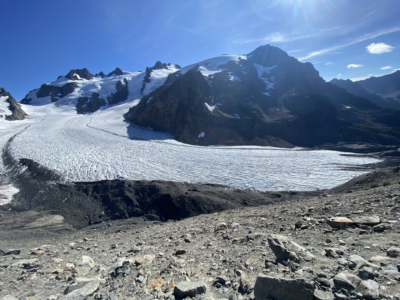 Headed out to the Blue Glacier with day packs at 3 pm...so much easier to hike! Views started to open up and we could see Mount Olympus and the Blue Glacier along a section of the trail which was reminiscent of Kendall Katwalk. Needed to take care when hikers coming from the other direction passed us. We arrived at the infamous washout and ladder. Our timing was perfect since a large group of teenagers had just come up the ladder and we only had to wait for one person to come up before going down. The ladder is in good condition and is much less scary to use than it looks. At the base of the washout, there is a steep climb up with lots of scree and dusty footing to get to Glacier Meadow. Once you get to the top of this incline, the trail levels out with pine-needle carpeted trail to the Glacier Meadow campsite. Onward to Blue Glacier. We elected to skip the terminus and head up steeply to the lateral moraine. This is a rocky, steep climb with absolutely no indication of where the glacier is until you get to the top, turn the corner then oh my! The lateral moraine is reminiscent of Railroad Grade trail at Mount Baker with the sides steeply dropping on either side but plenty wide. We had a late lunch and had the moraine all to ourselves for 30 minutes before heading back to our campsite at Elk Lake where it turned out that the large group of teenagers were camped near us at the group campsite. Mosquitos were starting to bite and there were black flies that liked to take a chunk of your flesh buzzing around.