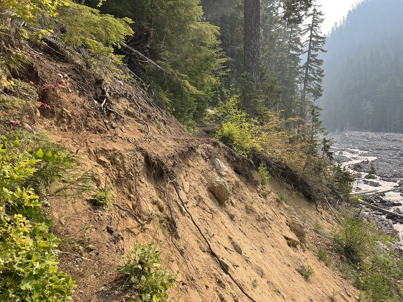Safety alert! This trail is closed in part due to glacier debris flow hazard. Use morageology.com to assess risk for the day of your hike. Extended hot sunny weather and/or extended heavy rain greatly increases risk. Debris flows are fairly common. There was a debris flow that reached well below the suspension bridge August 16 during the heat wave.just a few days prior to our hike.