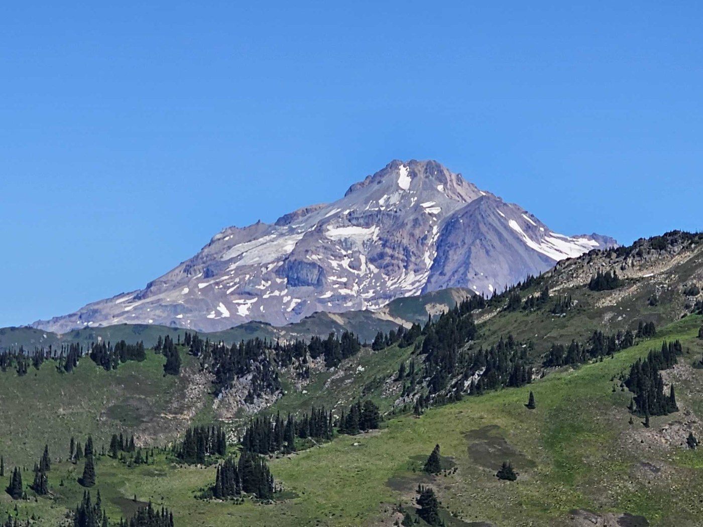 Our group of eight, ages 30 to 73, started our four day backpacking trip at the end of the North Fork Sauk River road, nine miles beyond its departure from the Mountain Loop road. Our route would call for a first night camp at what's called Spring Camp at timberline on Long John Mountain, a second night at the upper Blue Lake at the eastern end of the Pilot Ridge trail, and a third night return to Spring Camp after a several mile Loop over the 'high trail' above Blue Lake. We found the trail beautifully engineered and well constructed but relatively seldom used and not recently maintained. Foliage and brush for the first 3 miles to Curry Gap would get you really wet on a damp day, but beyond that point the trail gains perhaps 2000 feet elevation to timberline and the views of Slian Peak and the Monte Cristo peaks are very rewarding. Ups and downs typical of Cascade Mountain ridge walking, in and out of timber, brought us to Spring Camp after 7 hours from our start. Younger and more athletic hikers carrying less than 42 pounds on their back might do it quicker, but in any case Spring Camp has the last water source before the next day's sub alpine hike over June Mountain to the lower Lilttle Blue Lake and the larger Blue Lake a mile beyond and 300 feet higher. Both lakes have excellent campsites. We were surprised nobody was overnighting at the lower Lake and we shared the upper Lake with only one other party, at considerable distance away, in the first week of August! Lots of small trout were breaking the lake surface and some were easy prey for a keen eyed osprey. We swam, very briefly, in cold clear mountain lake water. Our third day on the trail was really the payoff so many of us seek. The 'high trail' ascending from Blue Lake to reconnect with the east end of the Bald Eagle Trail is really a somewhat constructed, somewhat hiking boot built, short but steep but rewarding pitch, up and over the ridge to big views of Glacier Peak, the Cascade Crest, Skykomish Peak and the North Fork Skykomish River Valley. The long third day's return to Spring Camp is classic wilderness alpine cruising. And our final, fourth day return to our cars was completed in less than 6 hours. If you're looking for a backpacking trip with views, meadows, flowers, alpine lakes and solitude on a well built but little used wilderness trail, this is a good one to consider.