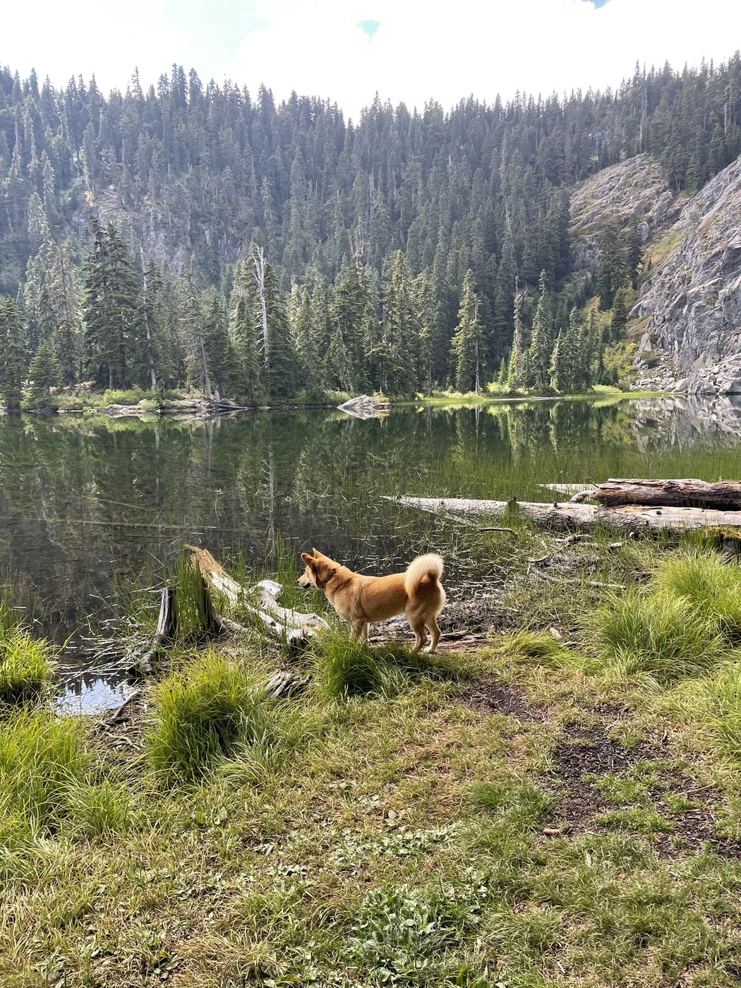 I went to the summit first. Clouds were rolling in and out, but I still got to enjoy the views and was glad to have the lookout to myself and my dog. Reached it in about 2 hours. From there I went to the lake. It was a nice view, but neither my dog or I were tempted to jump in, so it was a short stop. The bottom of the lake looks mucky and fortunately it wasn’t hot at all. About three downed trees that required scrambling on the way to the lake. Bugs were manageable at the lookout, but worse at the lake.
