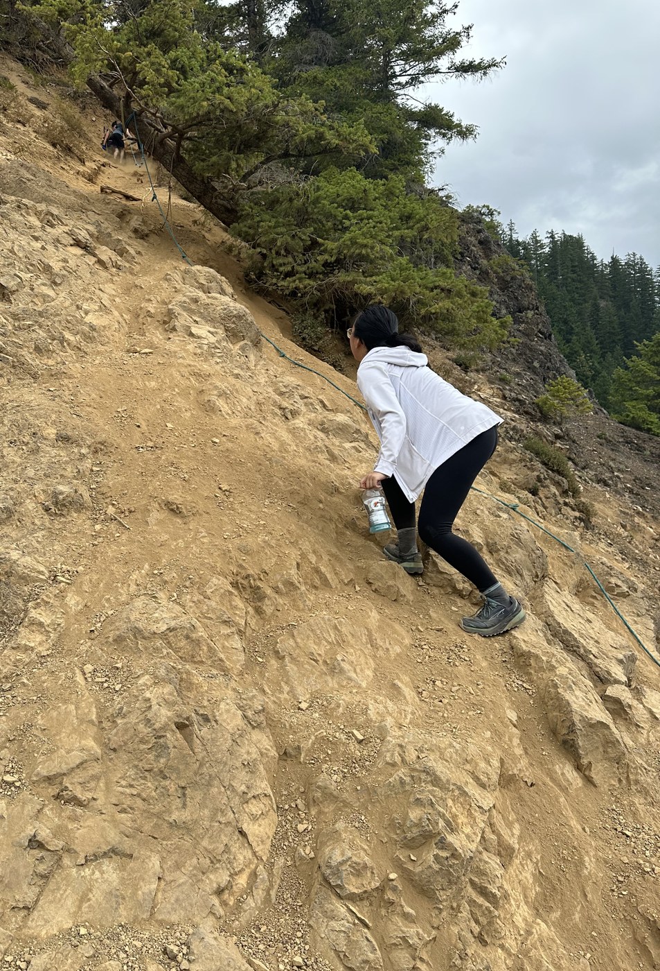 After the End of Maintained trail, you encounter the rope section. It's a bit steep, probably a bit more than 50°. Only one person/group can go a single direction at a time so there tends to be a large line waiting. Standing below in line was a bit sketch. I'm not sure if it's because of how dry it was but those climbing/trekking up would often loosen and cause gravel and rocks (at least the size of a baseball) to tumble down towards those below which can be even seen in the picture I took, so please give plenty of space to others,