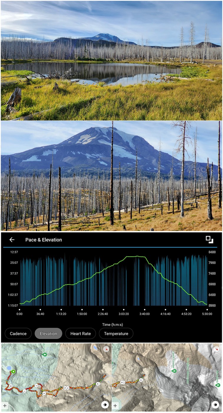 - Road/Parking: Our access was from the south, staying Hood River, OR. The (long) dirt road to the Bird Lake trailhead is in good condition with just a few bumps of note, and doable in any car; the 2015 burn offers fantastic views of the mountain on the ascent; the gate will be locked for the season at 4:30pm PST on 9/7; paid for our permit at Mirror Lake, and then parked up the road at Bird Lake, displaying the permit on our dash; there is a (lost?) cow roaming the forest on NF82 ~3.5 miles up from the junction - not sure how long a cow will last out there, so hope she is GPS tagged