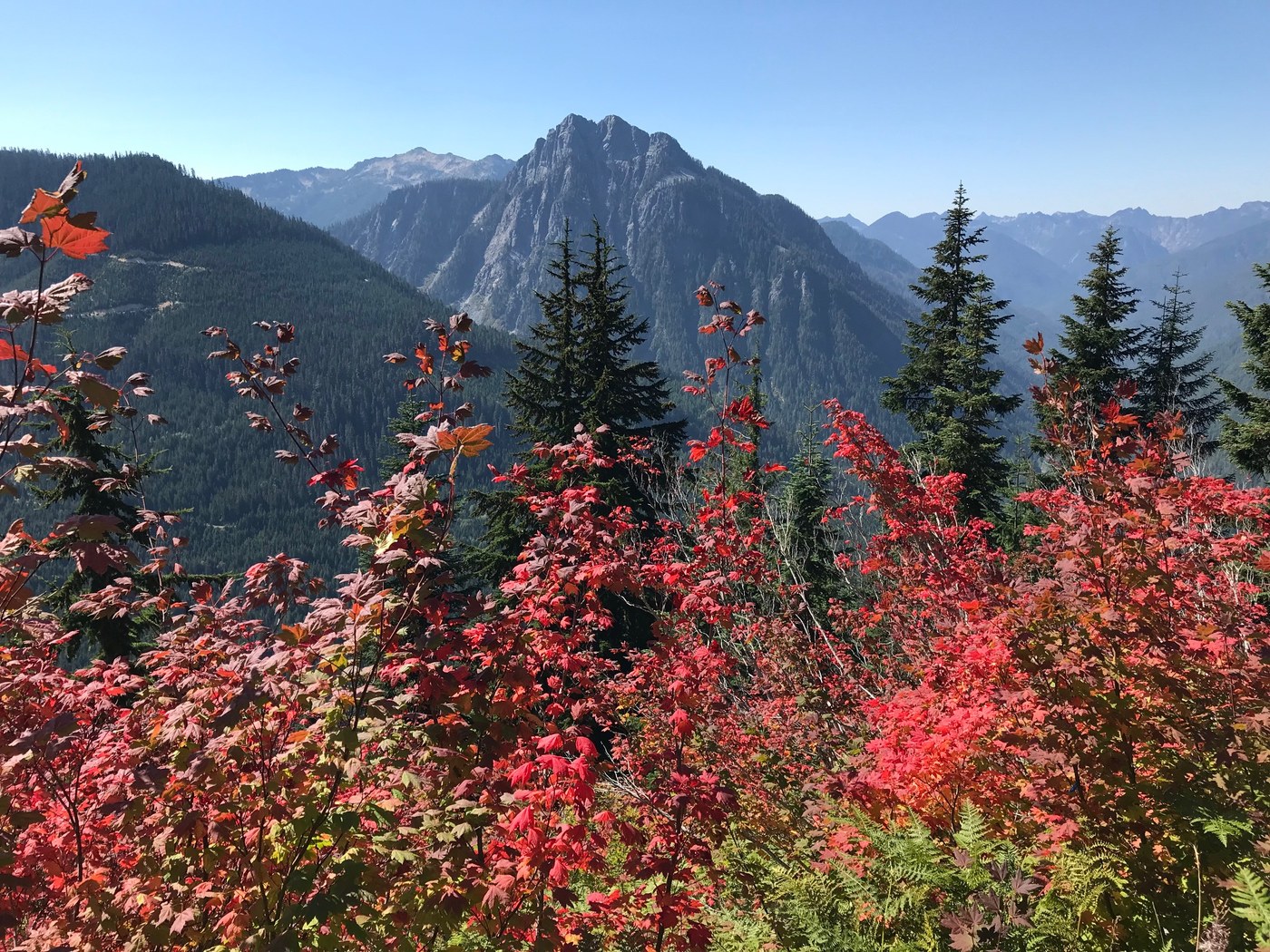 We geared up and after a quick review of the sign board set off. Pretty soon there is Y junction and if you take the nicest looking tread to the left you might end up surprising someone using the back country toilet so definitely hang right there. Then there are lots of little drainages to climb up and down a little annoying when trying to find a rhythm, but on the way down they announce you are nearly done. The well moderated trail encourages overly fast hiking and I ended up feeling totally gassed after about an hour and had to take a big break. I had been concerned over the reports of the wasp nest and had wanted to get beyond that as quickly as possible. Taking the second half of the climb at a much slower pace we started to enjoy the opening views and after two hours arrived at the "end". The trail ends in a large blueberry patch. There are the amazing views mostly to the north and lots of little social trails with small places to sit. We took a spot in the shade to cool off. It's not a small area but with people sitting hidden by the bushes it can feel like you are crashing someone's picnic as you find your own spot. Blueberries were present but they are not numerous and are well past best, fabulous colors made up for that. Views were a little hazy and there is a smoky layer lower down in the valleys as you look toward a very gray Mount Glacier. We actually could smell smoke at the trail head but purple air was still reporting green for the closest air monitors when I checked later.