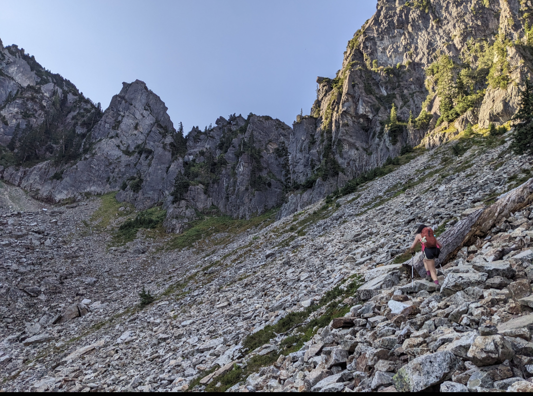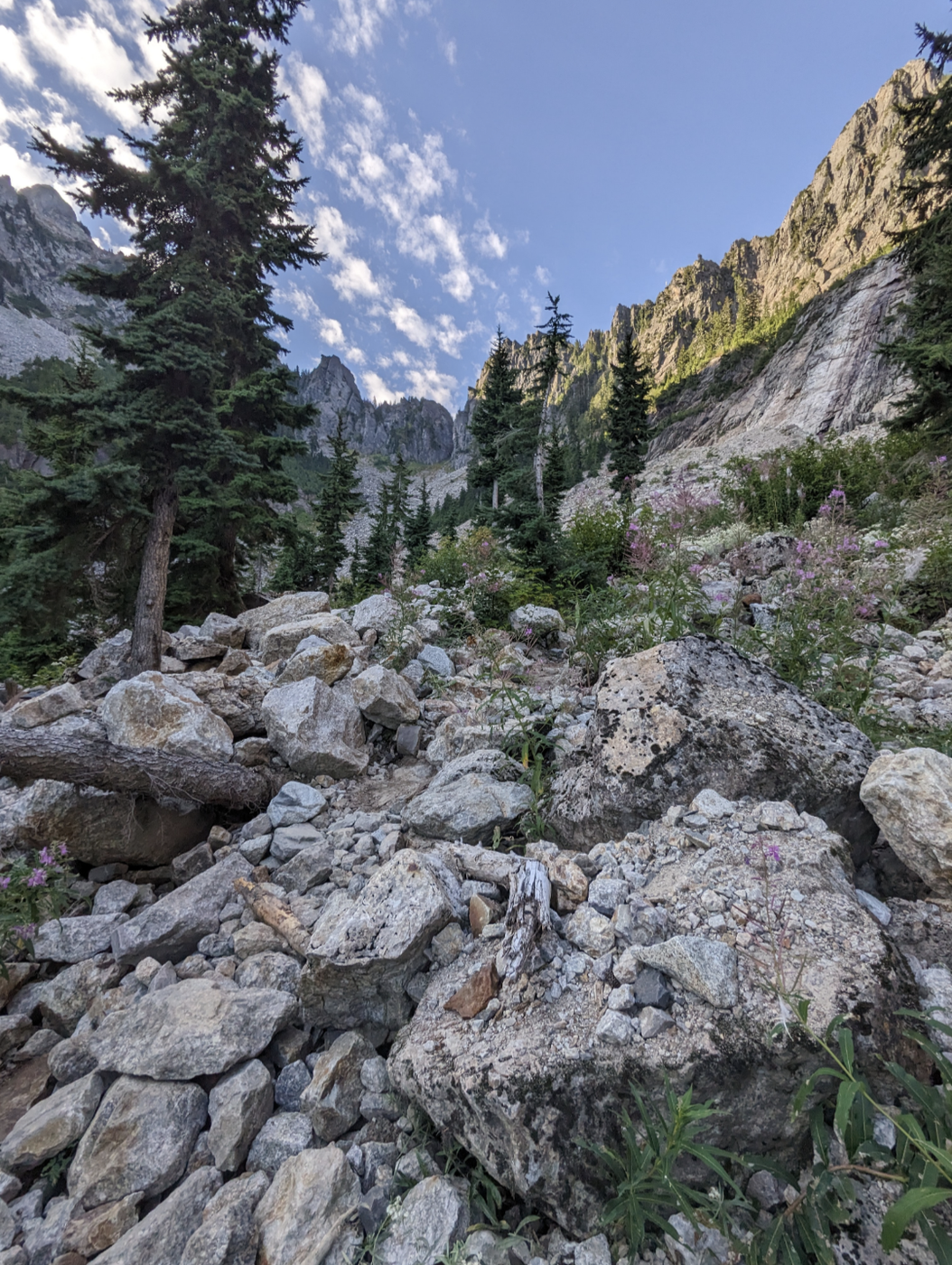 Pass to the foot of Vesper: Pretty flat giant rock field with awesome views. Rocks were pretty stable. On the way back this was a little hard to see but once you are on the path it is super clear. At the foot of Vesper you will join up with a creek, the only good water source other than the lake. It is narrow and very easy to cross. Keep an eye out as soon as you hit the street because it is easy to miss the path up. We checked out the lake but I thought it was much better from above.