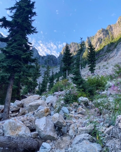 In the woods, I lost the trail a couple times but it seems like whatever side trails I took always led back to the correct place. Make sure you have maps downloaded for this hike! I came across the hornets nest around .8 miles in and didn't have any issues. Someone marked it on either side with paper plates so it's easy to know where it is going both directions. The talus field below Headlee wasn't too difficult from a route finding perspective, but you definitely need to keep an eye out for the cairns to spot them. The lower part of Headlee Pass was probably the sketchiest part on the way up and down. It's easy to slide out on the loose rock and other hikers higher up can accidently cause loose rocks to slide down the hill. Stay alert! After Headlee Pass, it was pretty smooth sailing to the summit. I followed the cairns up the scramble section and that worked out well. Definitely needed hands and feet for this section. Poles were also nice to have. The views from the summit were spectacular and well-worth the work!