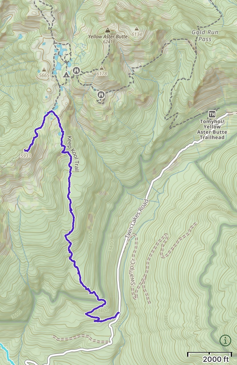This trail report is for the Keep Kool Trail, southern neighbor and another route to Yellow Aster Butte and Tomyhoi. At 2.6 miles in the Keep Kool trail connects to the Yellow Aster Butte and Tomyhoi trails. Note there is not a WTA page for the Keep Kool Trail, I’m guessing since this trail is no longer maintained. (Backup to the lack of maintenance are the 52 blowdowns. Not kidding.)