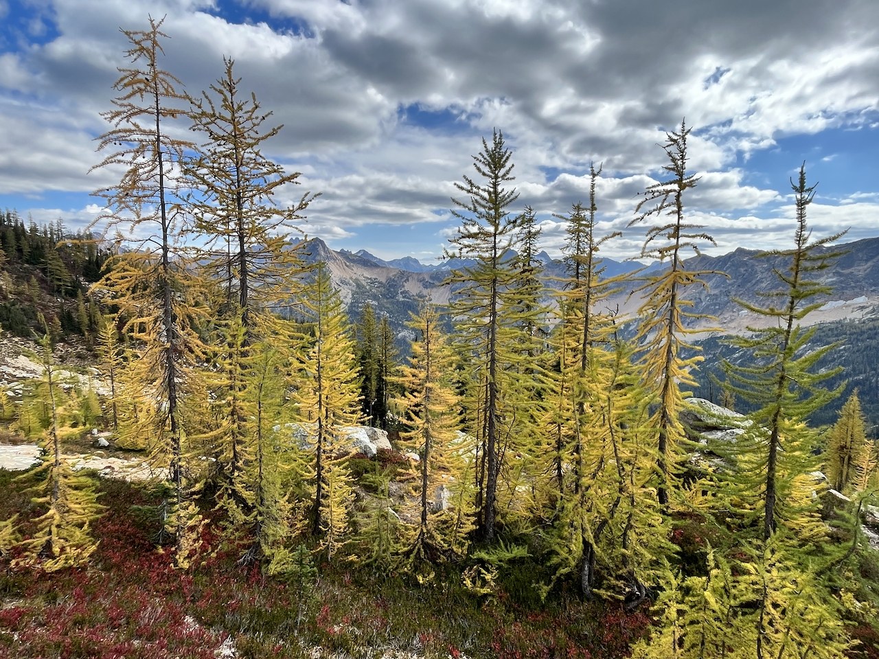 The first 3.5 miles of the trail climb gently up through lovely, mature forest. You catch the first view of the pass above about 2.5 miles from the trailhead, and a second view at 3 miles. The first larches appear just before the lower camping area, about 3.5 miles from the trailhead. After that, the larches increase in abundance and soon dominate the sparse forest. On the lower slopes the larches are just beginning to turn, but the higher you go, the more have turned to their beautiful autumn yellow. The blueberry bushes are red and purple already, and the azaleas and mountain ashes are orange, so there is plenty of fall color (see photos).
