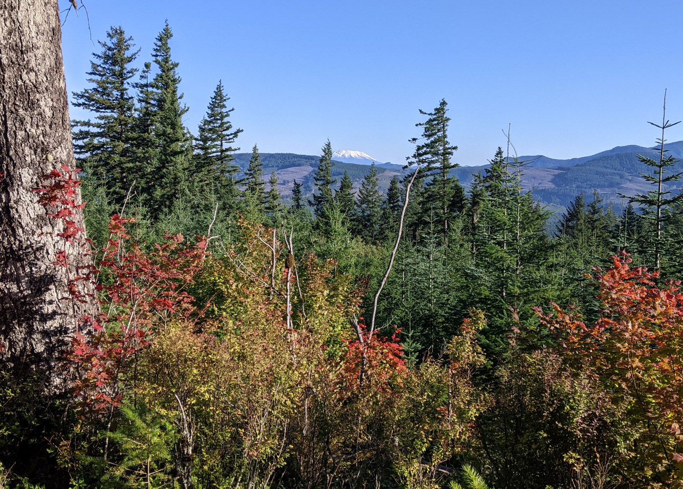 Chatted with two mountain bikers, preparing to ride to Hidden Falls in the parking lot. Saw one other car, and a pickup truck with horse trailer as well. The vine maples sported bright red and orange leaves as we set out on the the beginning of the Tarbell. Mt St Helens displayed snow on her upper reaches when we paused to admire the view from one of the picnic sites.
