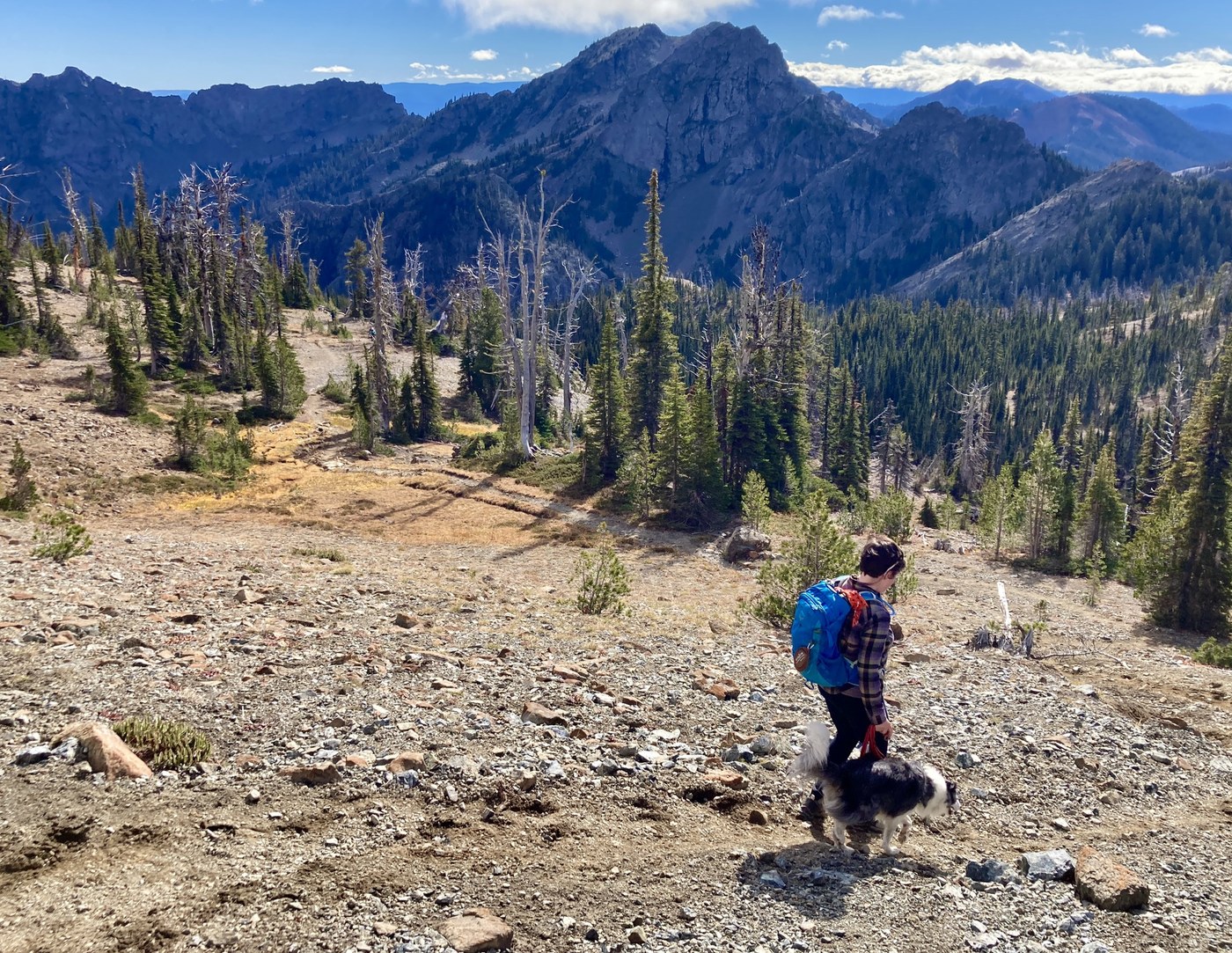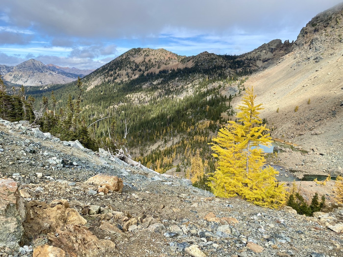 We didn’t hike all the way down to the lake because we’d had our fill of climbing once we got to the ridge. The few larches up on the ridge were at their peak, and I love looking down to the northeast and seeing the larches among the firs and pines below. The fall colors on the way up were equally beautiful.