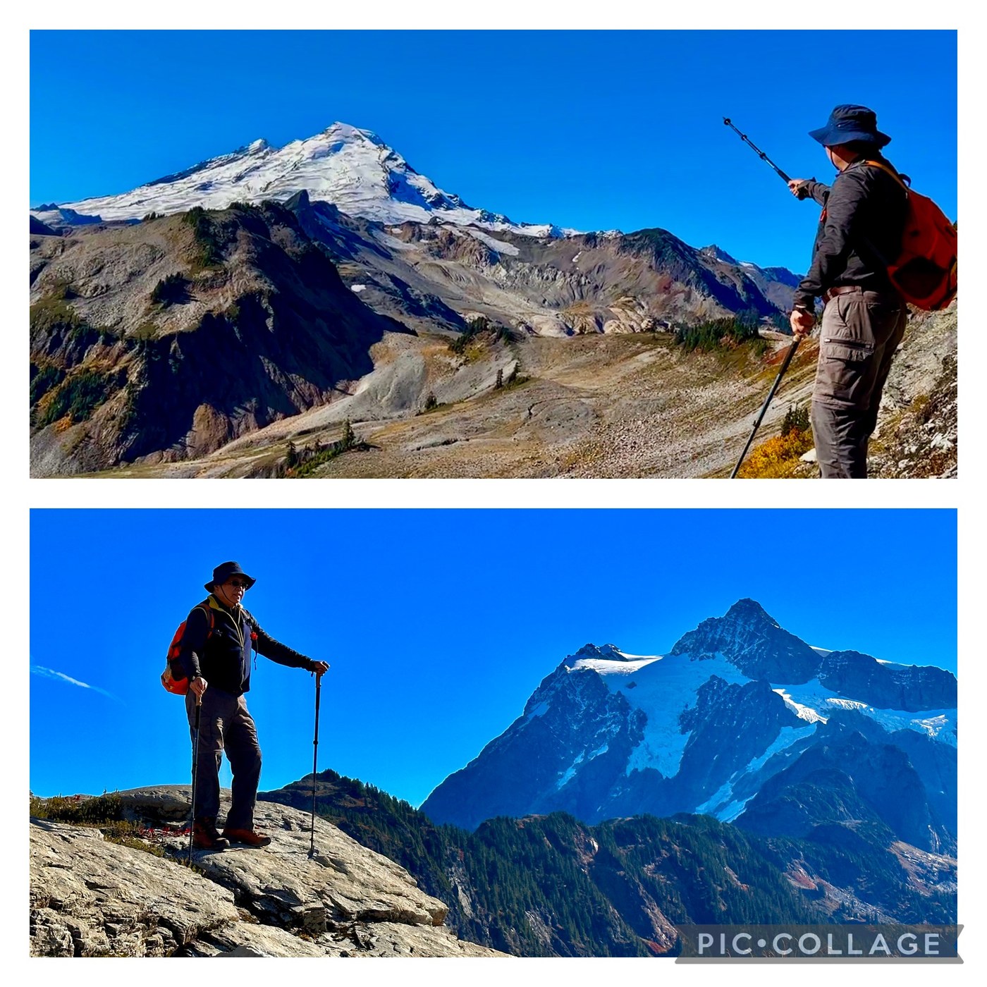 A sunny and warm fall day is priceless in Seattle. After just over 3-hour’s of drive, we arrived at Artist Point and started our ascent of 700 vertical feet to Table Mountain. Been here many times over more than 40 years, it is noticed that the condition of the steep but short trail actually got worse with more loose rocks and bigger steps. Still the autumn view between Mt. Baker and Mt. Shukson is unique and being able to navigate in shorts in October is precious.