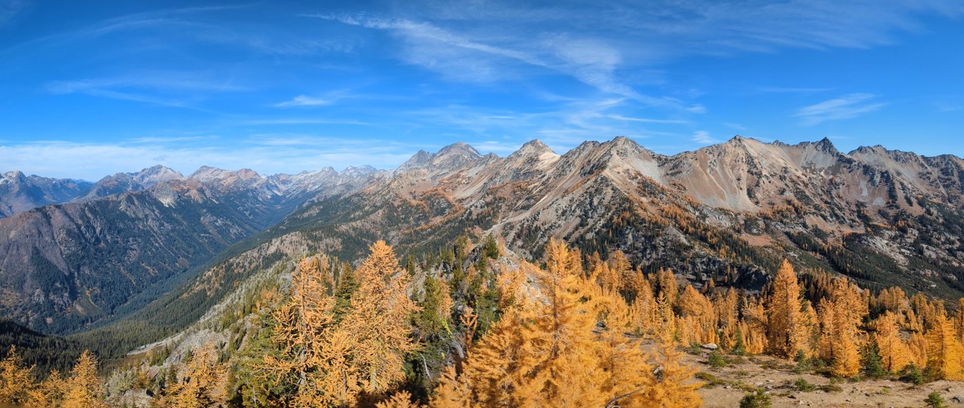 You start out in light tree cover and they thin as you climb so you get intermittent views of the valley and the glaciers and larches on Buck & Clark Mountains. As things open up you get some nice rock formations and some fall colors on your side of the valley, and just a hint of larches at the edge of the ridge. There were some plumes of tiny bugs in the morning that were so thick it was nearly impossible not to breath them in, but they were gone by the afternoon.