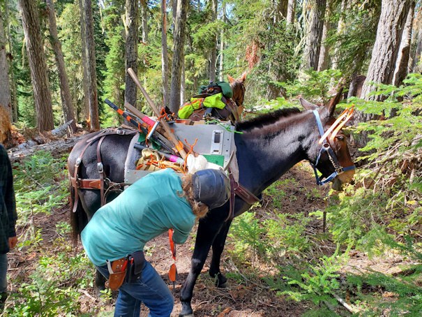 We knew that there was a WTA work party working on this trail just a couple week prior to our trip and hoped that the trail would be mostly clear. It wasn't. In spite of a tremendous effort by the WTA work team, we still encountered 73 logs across the trail up to the pass and another 22 logs on the other side down to French creek. It appeared the French creek side of the trail was not as widely used as the Cle Elum side and was difficult to navigate and in need of a serious brushing project. We encountered several large logs over 24" dia. on this section. Greg and I finally got to the project site, found our gear stash that had been packed in and got our camp set up and dinner as we were losing daylight. We started our work project on the Meadow Creek trail the next morning, working with the rest of the BCH crew and finished after 2 days of hard sawyer and tread work. After packing up our gear to be packed out on the mules, Greg and I headed out again for the grueling hike over 22 logs up to the pass and the 73 logs again going down to the trail head.