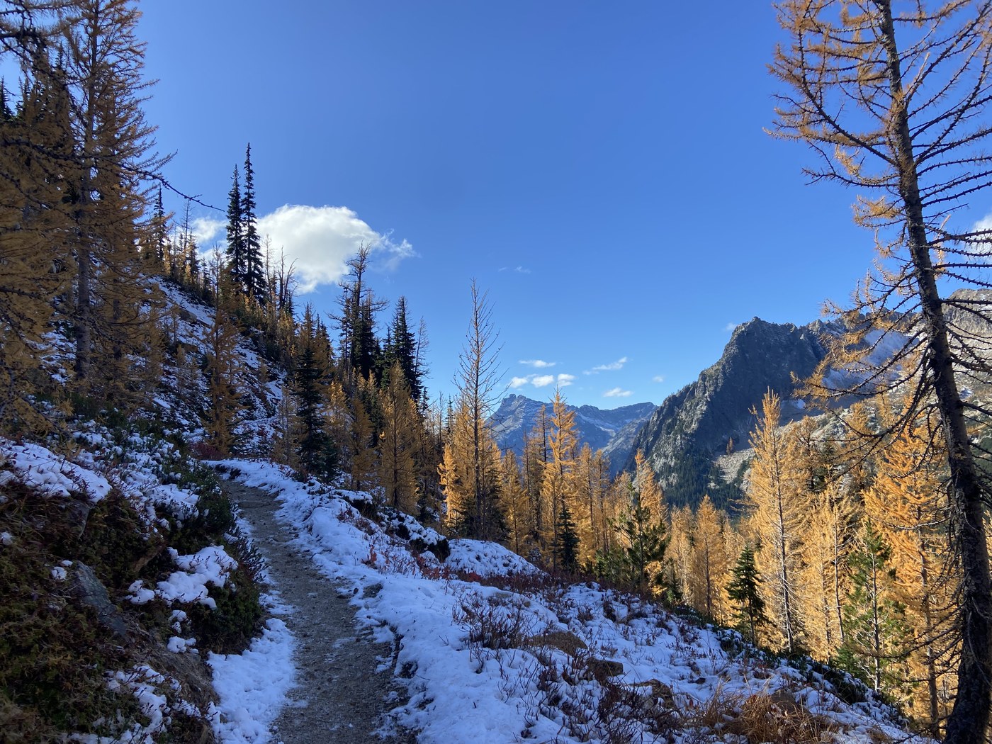 Went on Thursday hoping it wouldnt be very busy and we could still catch the larches. The larches are slightly past peak looking a bit more burnt orange but still nice to see. While we went for the larches this hike would be nice any time of the years, the views are great. Its more a steady climb than the typical Washington hike which is a nice break. No snow but tiny section in the shade was a bit icy.