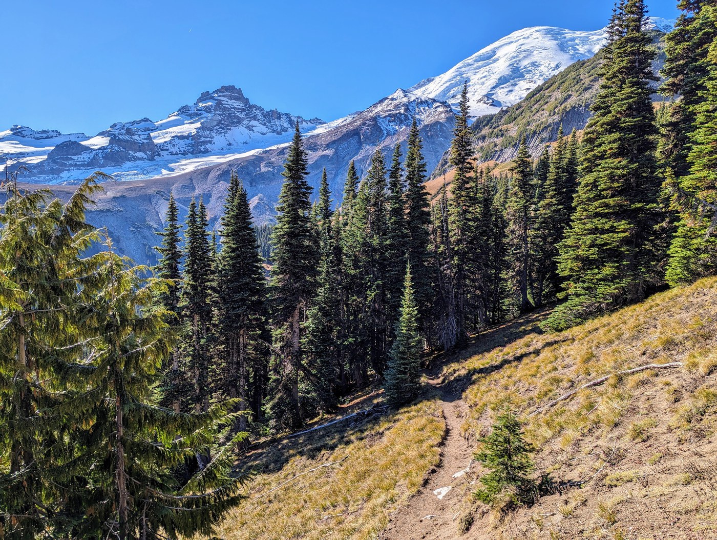 The loop is in great condition. There are two blowdowns, the first on Glacier Basin is trivial to step over, the second on the lower part of Sunrise Trail has a detour already trod around it. Doing the loop clockwise means getting up to the views a bit later in the day, however it makes for an easier descent as the Wonderland trail is smoother, wider, and softer than the Sunrise trail.