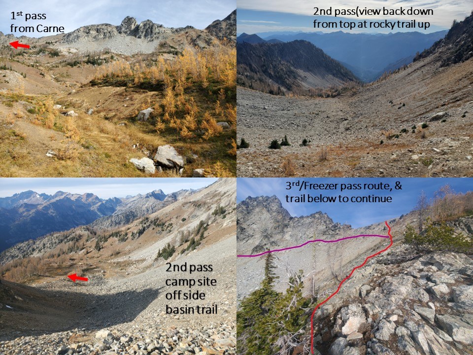The 2nd pass is a rockier climb to a gentle saddle then mostly straight across scree slope. Looking down to left (west) you will see why there's a side looping trail going down then back up- camp sites! Nice flat larch basin there (see pic). Then you climb up toward Freezer Pass but head more left/west just under the pass with a just visible dimple of trail in the rocky slope and a trail among the first patch of larches again just down a bit in elevation (see pic). If you're legs are dying and you'd like a camp with great views, someone impressively flattened out spots just over the slope of Freezers that's actually sheltered from the gusty wind up there and reportedly at the lakes as well. It's a trek to get water, but may be the less windy spot up there.