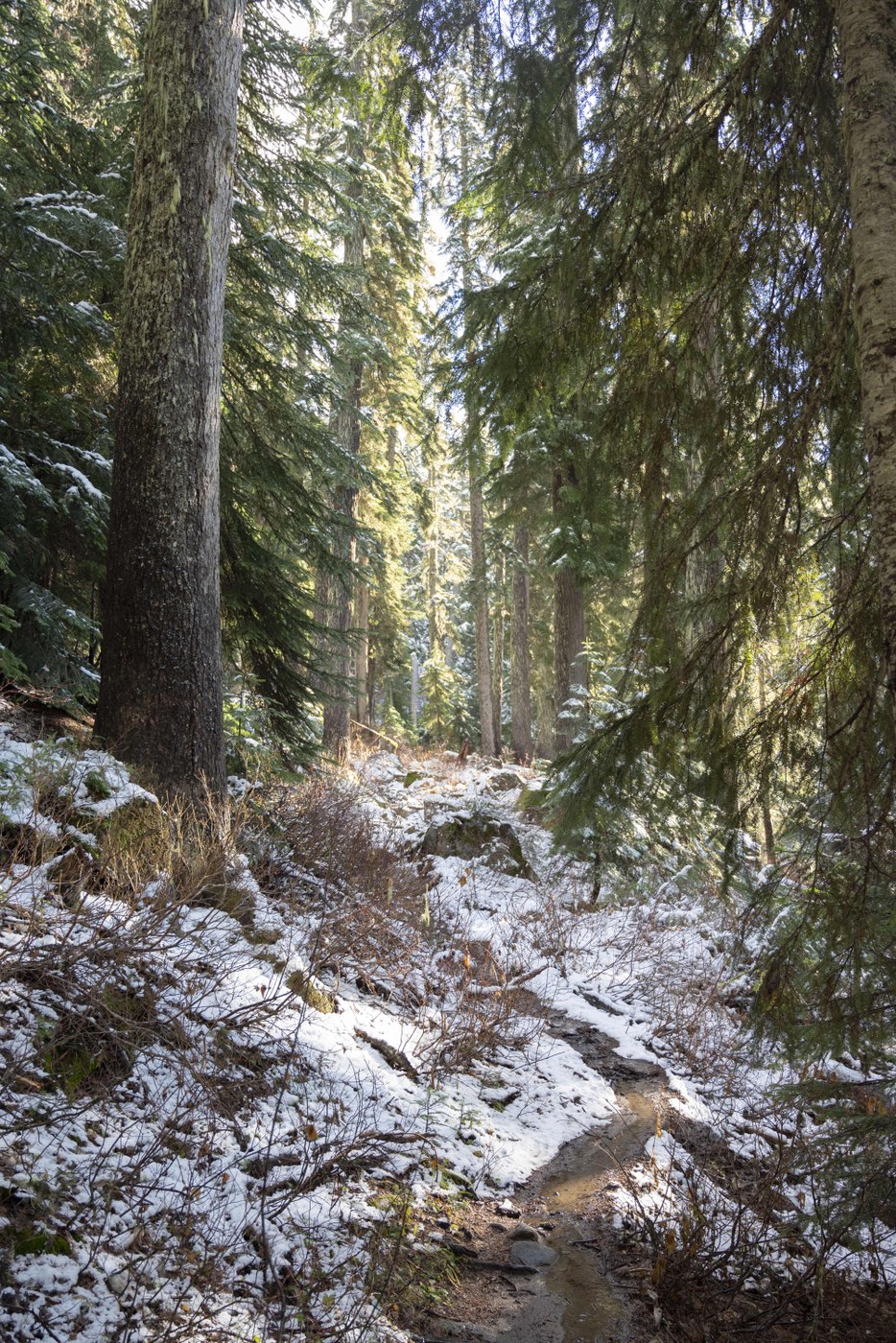 It was a gorgeous, blue sky day wedged between a rainy week. We decided to squeeze a hike in. Our intent was to hike Minotaur Lake, but the gravel road (FS 6700) had a little more snow covering than we thought. Not being too familiar with the area, and not having snow tires/chains, we decided to not continue the extra 4 miles to the Minotaur Lake trailhead, and instead went back to the Smithbrook trailhead that we had noticed on our drive up.