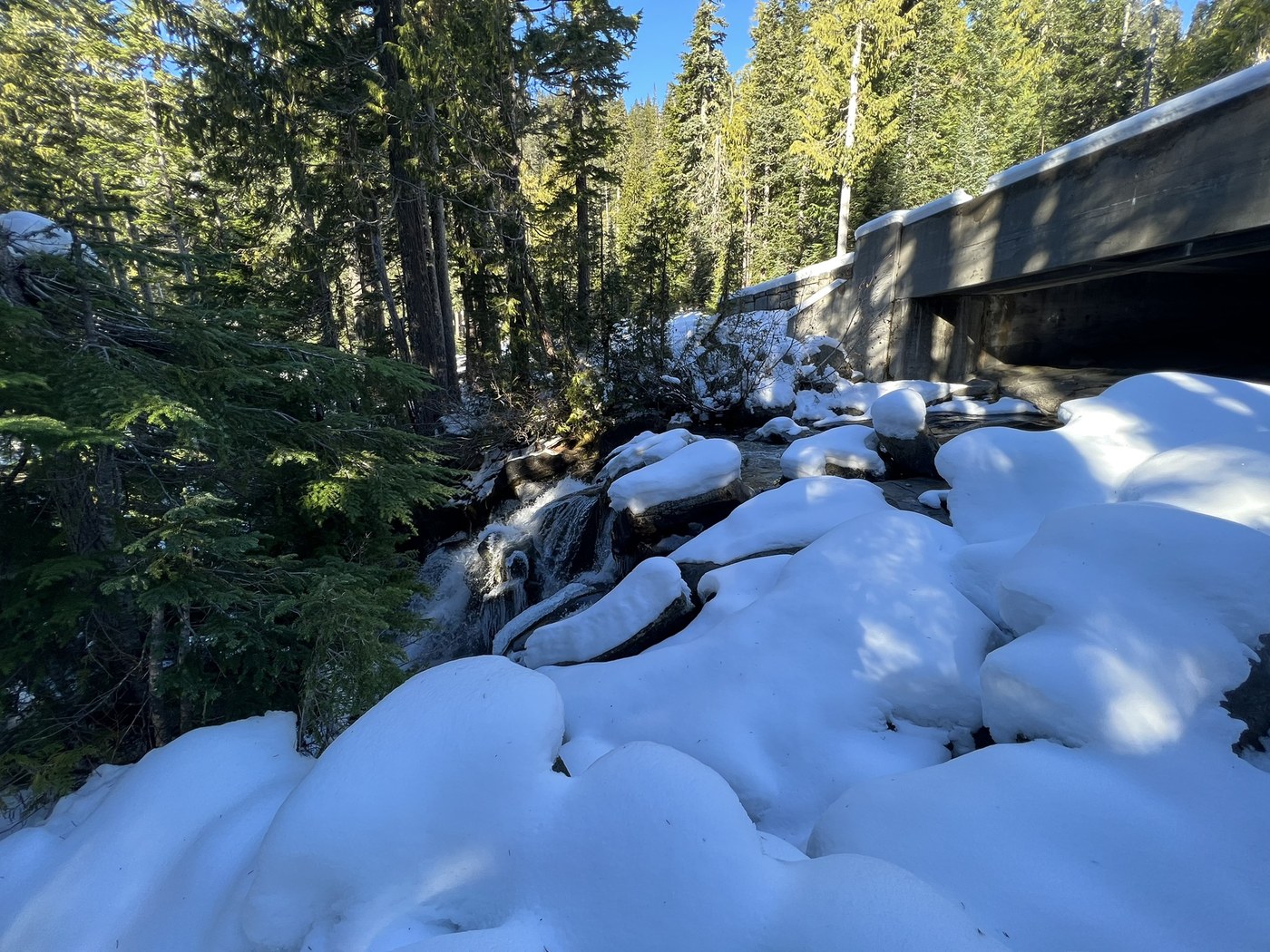 The trail is generally in great shape, but there is significant snow accumulation in some areas. It’s passable if you like post holing- otherwise snowshoes would be a great choice.
