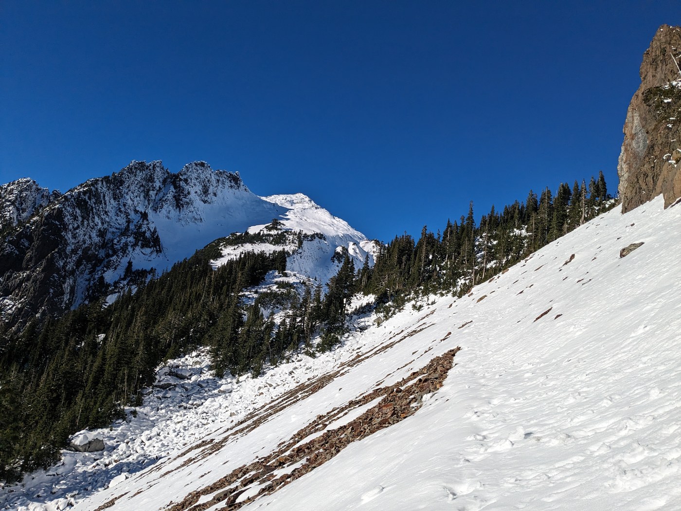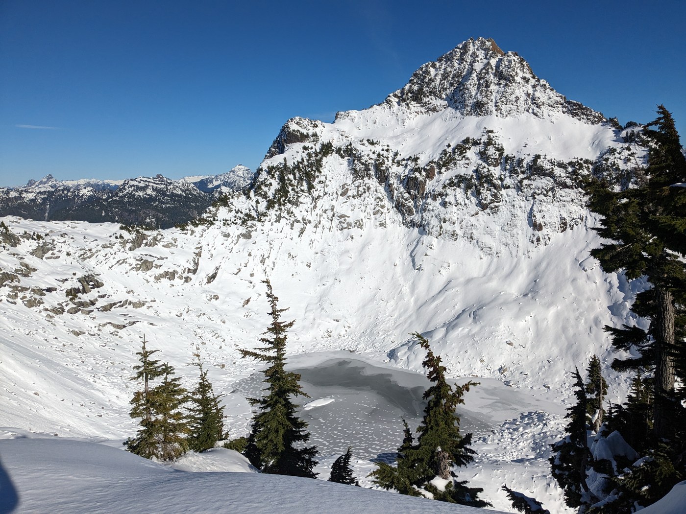 We started around 9:30am from the TH. Rivers are too shallow now and crossing them was pretty easy. Trail is snow free up to the basin. Trail to the pass was broken which made pass ascent easier. On the other side tiny few days old boot track lead us to the lake. After the lake outlet we hiked towards the peak and broke rest of the trail to the summit. Snow conditions were pretty good, mostly solid crust and 5-10 inches of slightly wet snow on top, some postholes but not much, at some spots crust was super hard and icy though. We had snowshoes but never felt we need to put them on. Summit views were awesome as always.