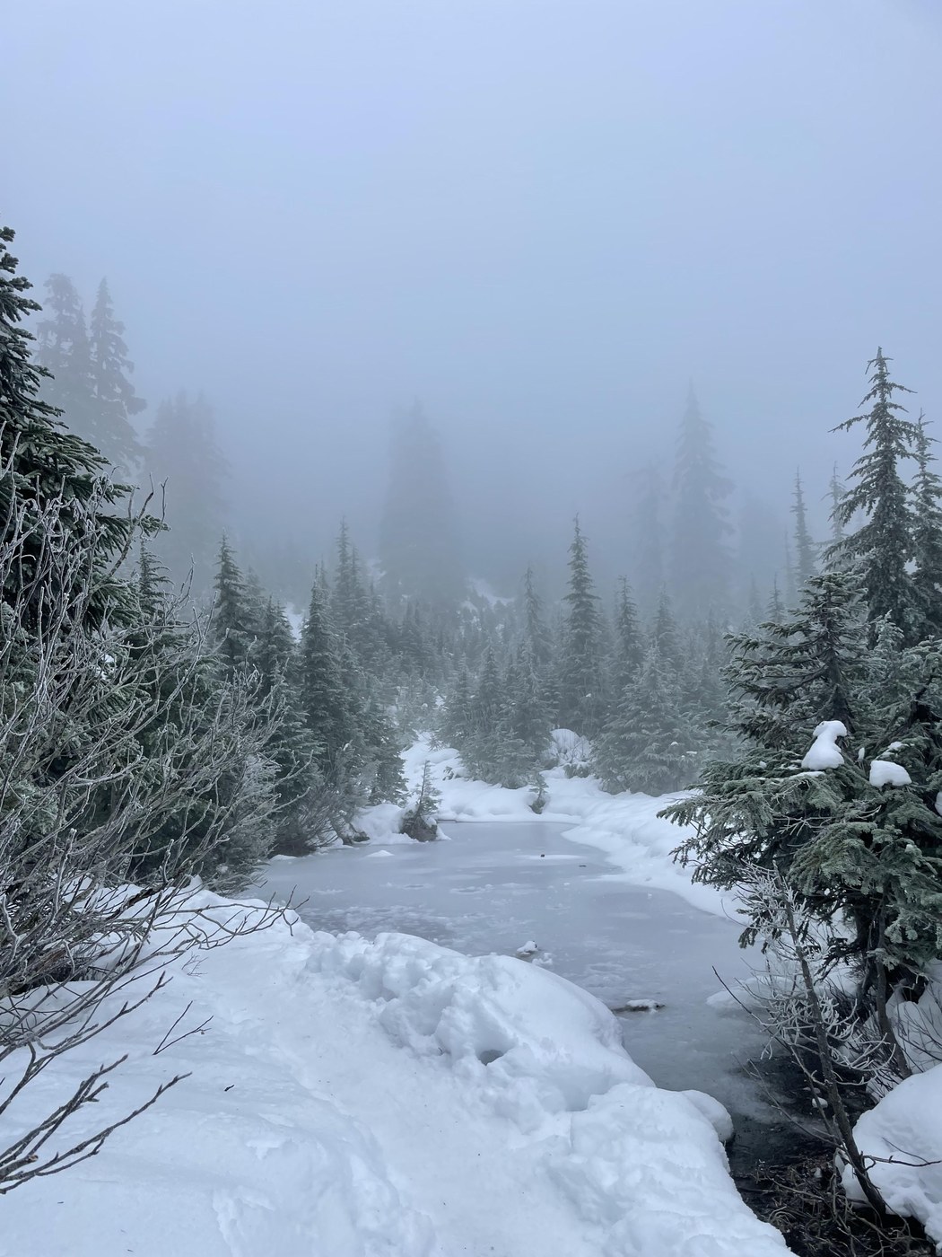 I got to the trail head at 8 AM. There is plenty of parking as the ski season hasn’t started. That being said, I was surprised by the number of cars and people. Overall, the trail conditions were fine although it’s helpful to have spikes. I was concerned as some younger hikers were only wearing tennis shoes. Visibility wasn’t great at the lake, but it was still beautiful. Overall, it was a nice hike.