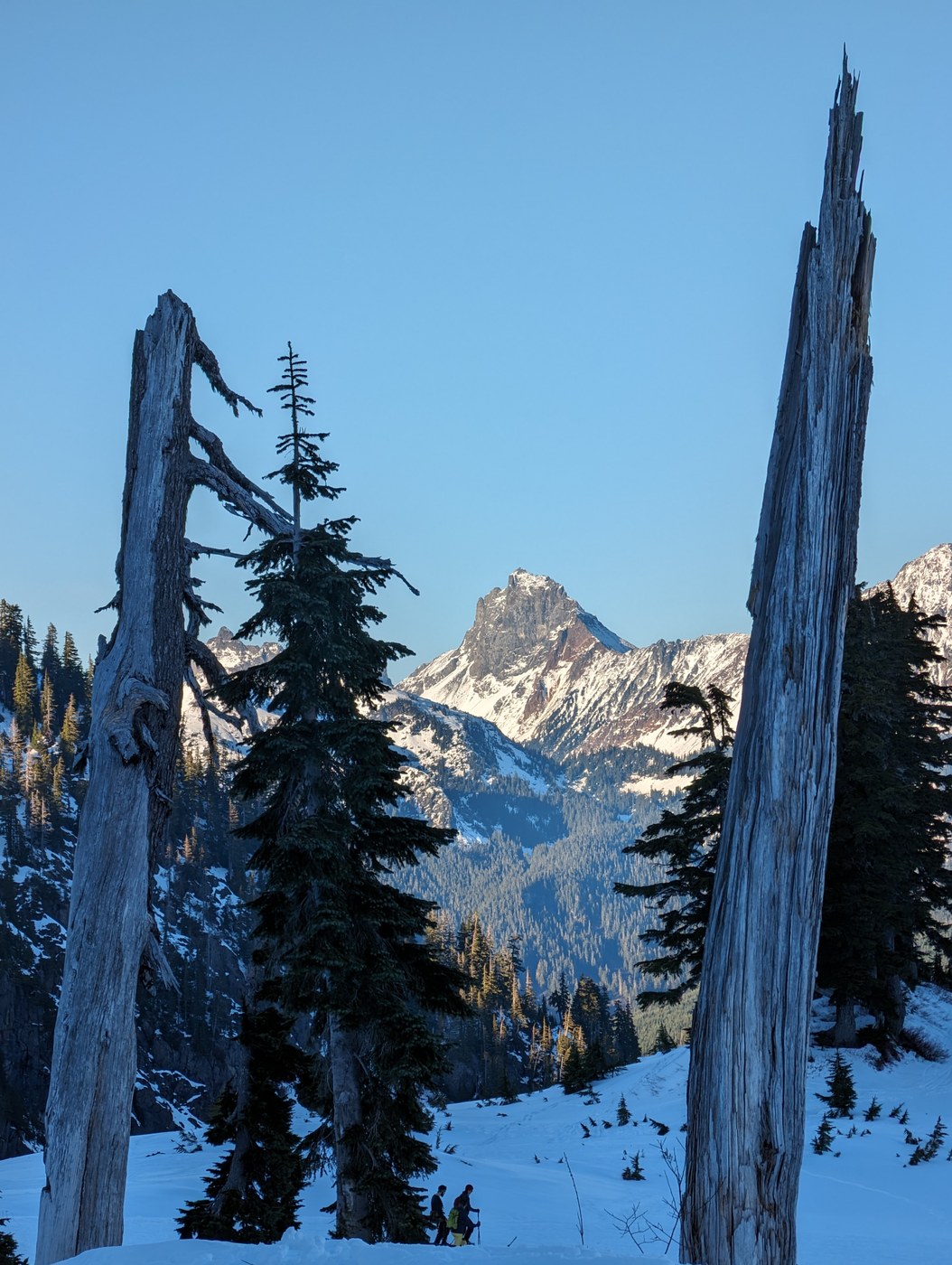 Nice combo of firm snow with a little powder making for nice snowshoe conditions. Unique opportunity to hit the snow covered trail before the ski area opens and with minimal avalanche risk. Because the ski resort and lifts aren't open yet the entire place is open to snowshoes, hikers, and backcountry ski/snowboards as a bit of a free for all, which is a little messy but fun and means more parking than usual. Today the road was compact and safe enough for hikers to walk right up as far as the upper Artist point parking lot which I have never seen before and there was some cool ice along the road. You def need a map up here because blindly following tracks can easily get you in trouble. We saw a few people follow skiers up some danger slopes. We went up to Huntoon Point and it was stunning up there. The non road trail is steep in areas and not a beginner trail.