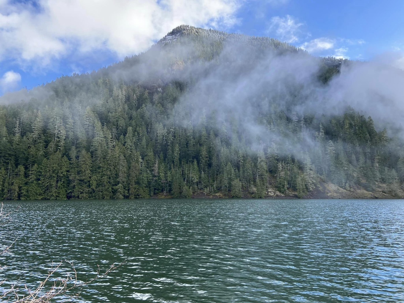 I knew I probably wouldn't make it all the way to the upper lake, and unfortunately, I was right. After leaving lower Lena Lake, the trail gets more rocky and difficult. There were a couple blowdowns to climb over. Longer stretches of the trail were covered with small streams. But I happily pressed on, reveling in the quiet, magical forest. This came to an abrupt halt at the big stream crossing at around 2630 ft. Sadly, the giant log was coated in ice, and I couldn't even climb up it without slipping. The stream was raging, and there was no other way across. I suppose in hindsight, if I had been able to somehow get up, I could have scooted across on my butt. But oh well...It was getting late anyway. I turned around and went back. Still some nice views to be had, and the sun was trying to peek out.