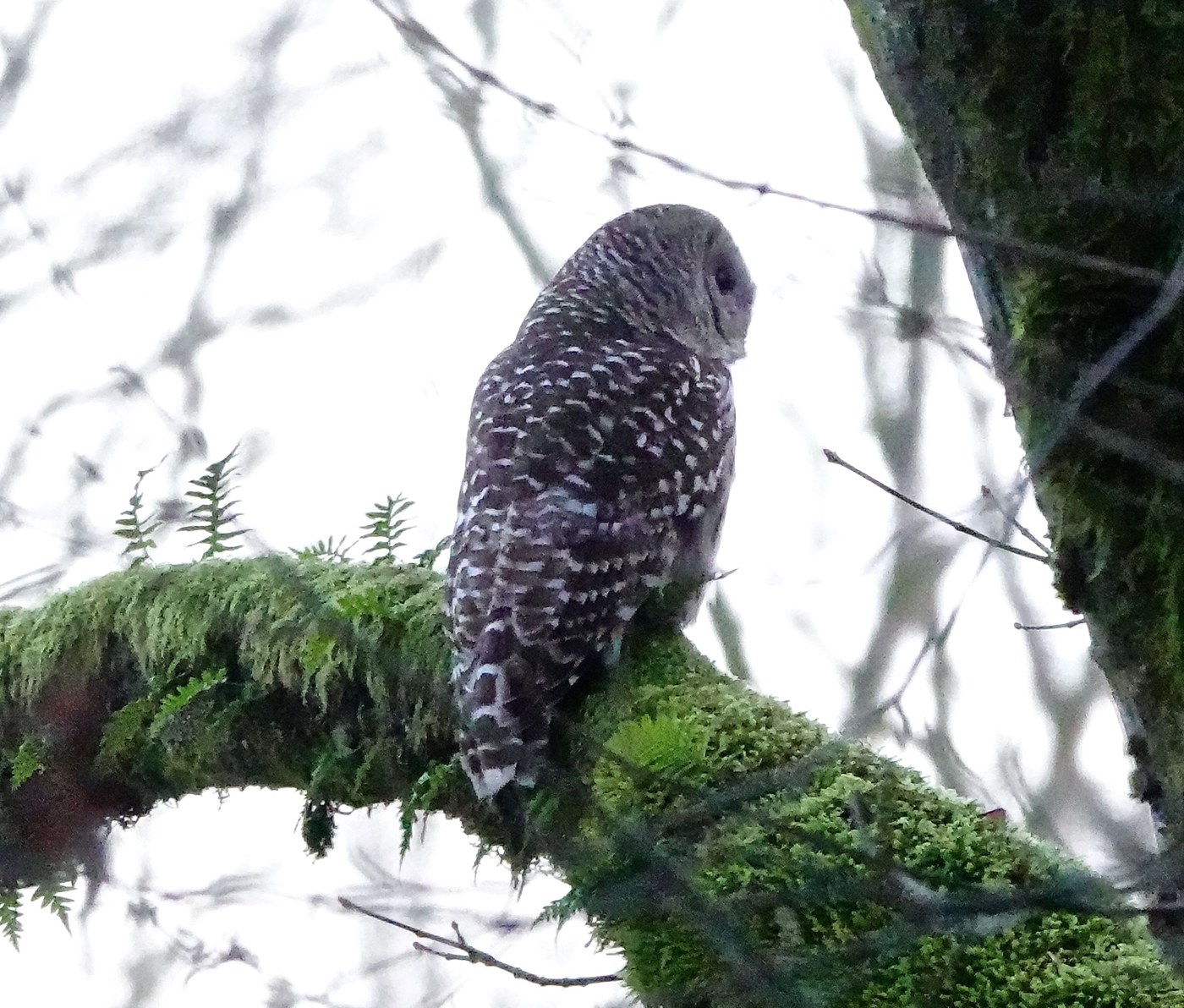 After meandering the Brewery Park at Tumwater Falls, we had 90 minutes before dark to meander Nisqually NWR. We started on the Twin Barns Loop and met a voulnteer who told us there was a barred owl near the Nisqually River Overlook. When we arrived in the area, the owl flew away, but Bob saw it again a few minutes later. We saw a few mallards and many widgeons, but no other birds.