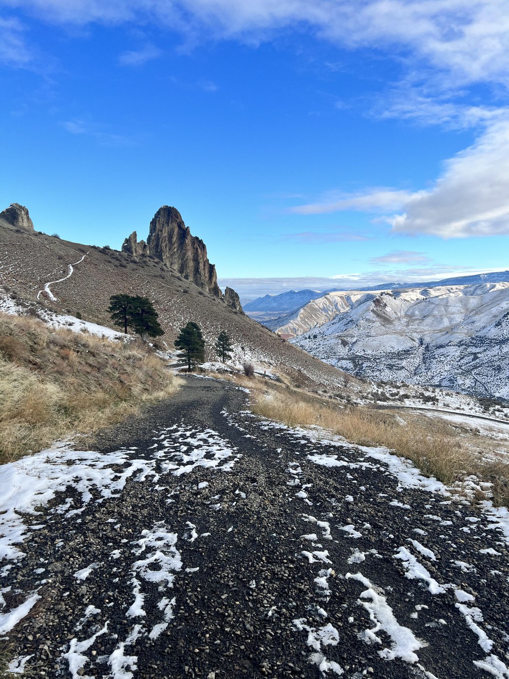The trail is in good condition right now with very little snow and hardly any mud. The steep gravel section that is typically very loose in the drier months has good traction at the moment because the rocks are compacted due to moisture, so it's actually much more enjoyable than usual. The snow covered hillsides contrasted with the blue Columbia River made for some beautiful summit views!